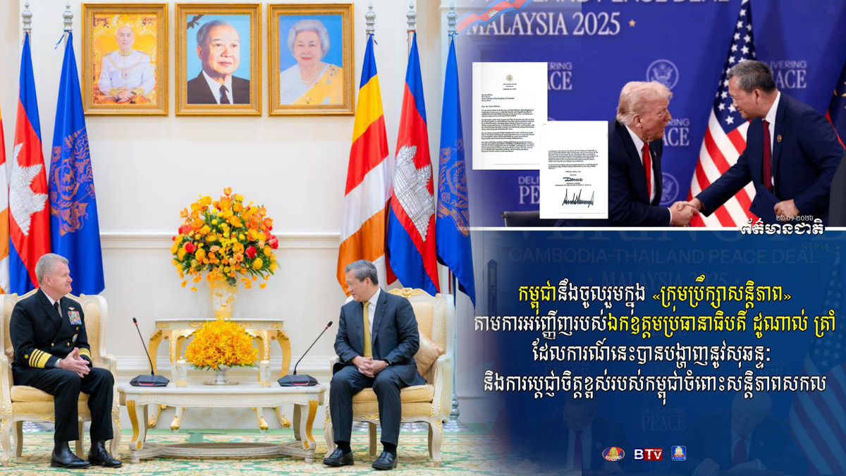 ភ្នំពេញ ៖ កម្ពុជានឹងចូលរួមក្នុង «ក្រុមប្រឹក្សាសន្តិភាព» តាមការអញ្ញើញរបស់ឯកឧត្តមប្រធានាធិបតី ដូណាល់ ត្រាំ ដែលការណ៍នេះបានបង្ហាញនូវសុឆន្ទៈ និងការប្តេជ្ញាចិត្តខ្ពស់របស់កម្ពុជាចំពោះសន្តិភាពសកល។ នេះបើតាមការបញ្ជាក់របស់សម្ដេចមហាបវរធិបតី ហ៊ុន ម៉ាណែត នាយករដ្ឋមន្ត្រីនៃកម្ពុជាក្នុងជំនួបជាមួយនាយឧត្តមនាវី Samuel Paparo មេបញ្ជាការ នៃបញ្ជាការដ្ឋានឥណ្ឌូ-ប៉ាស៊ីហ្វិកអាម៉េរិក នៅថ្ងៃទី២៦ ខែមករា ឆ្នាំ២០២៦នេះ នៅវិមានសន្ដិភាព រាជធានីភ្នំពេញ។​ក្នុងឱកាសជំនួបនេះមេបញ្ជាការ នៃបញ្ជាការដ្ឋានឥណ្ឌូ-ប៉ាស៊ីហ្វិកអាម៉េរិក បានថ្លែងអំណរគុណ និងសម្តែងនូវក្តីសោមនស្សរីករាយដែលបានជួបសម្តេចបវរធិបតីជាថ្មីម្តងទៀត ក្នុងដំណើរបំពេញទស្សនកិច្ចលើកទី២ នៅកម្ពុជា។ ឯកឧត្តមបានសម្តែងការពេញចិត្ត និងវាយតម្លៃខ្ពស់ចំពោះវឌ្ឍនភាពនៃទំនាក់ទំនងសហរដ្ឋអាម៉េរិក-កម្ពុជា ជាពិសេសកិច្ចសហប្រតិបត្តិការលើវិស័យការពារជាតិ។ ជាមួយគ្នានេះ, ឯកឧត្តមបានថ្លែងអំណរគុណចំពោះរាជរដ្ឋាភិបាលកម្ពុជា ដែលបានអនុញ្ញាតឱ្យនាវាកងទ័ពជើងទឹកសហរដ្ឋអាម៉េរិកចូលចតនៅមូលដ្ឋានសមុទ្ររាម ដែលនេះជាសក្ខីភាពឆ្លុះបញ្ចាំងពីការពង្រឹងទំនាក់ទំនងយោធាកាន់តែស៊ីជម្រៅរវាងប្រទេសទាំងពីរ។ជាការឆ្លើយតប, សម្តេចបវរធិបតី បានវាយតម្លៃខ្ពស់ចំពោះកិច្ចសហប្រតិបត្តិការដ៏ល្អប្រសើរលើវិស័យយោធារវាងប្រទេសទាំងពីរ នាពេលកន្លងមក និងបានគូសបញ្ជាក់ថា ការចូលចតនៃនាវាជើងទឹកសហរដ្ឋអាម៉េរិកនៅកម្ពុជា នាពេលនេះ គឺជាលទ្ធផលជាក់ស្តែងនៃទំនាក់ទំនងទ្វេភាគីដែលកំពុងរីកចម្រើន។ សម្តេចបវរធិបតីមានជំនឿយ៉ាងមុតមាំថា ទំនាក់ទំនងរវាងប្រទេសទាំងពីរ នឹងត្រូវបានបន្តពង្រឹង និងពង្រីកបន្ថែមទៀត។ ទន្ទឹមនឹងនេះ, សម្តេចបវរធិបតី បានថ្លែងអំណរគុណយ៉ាងជ្រាលជ្រៅចំពោះ ឯកឧត្តមប្រធានាធិបតី ដូណាល់ ត្រាំ ដែលបានដើរតួនាទីយ៉ាងសំខាន់ក្នុងការជំរុញឱ្យមានបទឈប់បាញ់ កម្ពុជា-ថៃ និងបានធ្វើជាសាក្សីក្នុងពិធីចុះហត្ថលេខាលើ "សេចក្តីថ្លែងការណ៍រួមទីក្រុងគូឡាឡាំពួ" កាលពីថ្ងៃទី២៦ ខែតុលា ឆ្នាំ២០២៥ នៅប្រទេសម៉ាឡេស៊ី។ សម្តេចបវរធិបតី ក៏បានជម្រាបជូនឯកឧត្តមនាយឧត្តមនាវី ថា កម្ពុជាបានទទួលលិខិតអញ្ញើញរបស់ឯកឧត្តមប្រធានាធិបតី ដូណាល់ ត្រាំ ក្នុងការចូលរួម "ក្រុមប្រឹក្សាសន្តិភាព"។ កម្ពុជានឹងចូលរួមក្នុងក្រុមប្រឹក្សាសន្តិភាពនេះ ដែលការណ៍នេះ បានបង្ហាញនូវសុឆន្ទៈ និងការប្តេជ្ញាចិត្តខ្ពស់របស់កម្ពុជាចំពោះសន្តិភាពសកល។ សម្តេចបវរធិបតី ក៏បានជម្រាបជូនឯកឧត្តម នាយឧត្តមនាវី អំពីការវិវត្តជាក់ស្តែង នៃស្ថានភាពព្រំដែនកម្ពុជា-ថៃ និងបានបញ្ជាក់ពីជំហរយ៉ាងច្បាស់លាស់របស់កម្ពុជា ក្នុងការគោរពបទឈប់