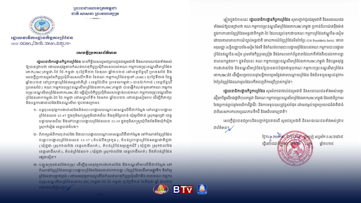 ​កម្ពុជា ផ្ញើកំណត់ទូតទៅថៃ ស្នើរៀបចំកិច្ចប្រជុំពិសេសបន្ទាន់របស់គណៈកម្មការ JBC ថៃ-កម្ពុជា នៅសប្តាហ៍ទី១ ខែមករា ឆ្នាំ២០២៦ នៅខេត្តសៀមរាប ដើម្បីពិភាក្សា និងបន្តការងារវាស់វែង និងខណ្ឌសីមា