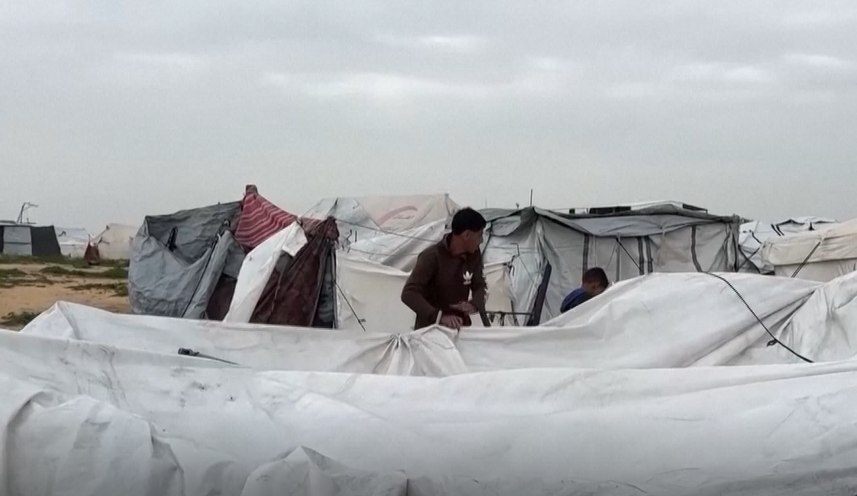ភ្លៀងធ្លាក់ និងខ្យល់បក់ខ្លាំង បានបំផ្លាញសំពត់តង់ជនប៉ាឡេស្ទីនជម្លៀសខ្លួននៅទីក្រុង Khan Younis តំបន់ហ្កាហ្សា