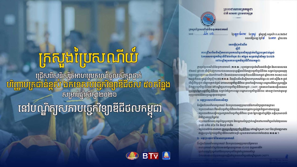 ក្នុងឆ្នាំសិក្សាថ្មី ២០២៦ ក្រសួងប្រៃសណីយ៍និងទូរគមនាគមន៍ (ក.ប.ទ.) នឹង​ជ្រើស​រើស​និស្សិត​អាហា​រូ​បករណ៍ចំនួន ៥០នាក់ ស្មើនឹង ២ថ្នាក់ ដើម្បីសិក្សាថ្នាក់ បរិញ្ញាបត្រជាន់ខ្ពស់ ឯក​ទេស​បច្ចេក​វិទ្យា​ឌីជីថល ព្រមទាំងធ្វើការបណ្តុះបណ្តាលវិធីសាស្ត្របង្រៀនជំនាញបច្ចេកវិទ្យាឌីជីថល នៅ​បណ្ឌិត្យ​សភាបច្ចេកវិទ្យាឌីជីថលកម្ពុជា (CADT) ក្នុងគោលបំណងបង្កើនធនធាន គ្រូ​ឧទ្ទេស​ផ្នែក​បច្ចេក​វិទ្យាឌីជីថល សម្រាប់គាំទ្រការបណ្ដុះបណ្ដាលបច្ចេកវិទ្យាឌីជីថល។ នេះបើយោង​តាម​សេចក្ដី​ជូន​ដំណឹងរបស់ ក.ប.ទ. ចេញផ្សាយនាថ្ងៃទី០៩ ខែមករា ឆ្នាំ២០២៦។សេចក្ដីជូនដំណឹងបានឲ្យដឹងដែរថា ការជ្រើសរើស​និស្សិត​អាហា​រូបករណ៍នេះ គឺ​ដើម្បី​ជំរុ​ញ​ការ​កសាង​ធន​ធានម​នុស្សឆ្នើមលើជំនាញបច្ចេកវិទ្យាឌីជីថល សម្រាប់​ចូលរួម​អនុវត្ត​យុទ្ធ​សាស្ត្រ​បញ្ចកោណ ​ដំណាក់កាលទី១ និងគោលនយោបាយរដ្ឋាភិបាលឌីជីថលកម្ពុជា ឆ្នាំ២០២២-២០៣៥ របស់រាជរដ្ឋាភិបាល។ចំពោះអត្ថប្រយោជន៍ដែលនិស្សិតអាហារូបករណ៍នឹងទទួលបានរួមមាន៖*អត្ថប្រយោជន៍នៃការសិក្សានិស្សិតជ័យលាភីអាហារូបករណ៍ នឹងទទួលបានអត្ថប្រយោជន៍នៃការសិក្សាដូចខាងក្រោម៖- ទទួលបានចំណេះដឹងលើបច្ចេកវិទ្យាឌីជីថលដែលមានតម្រូវការខ្ពស់ក្នុងទីផ្សារការងារបច្ចុប្បន្ន- ទទួលបានឱកាសធ្វើការស្រាវជ្រាវលើបច្ចេកវិទ្យាឌីជីថល ដូចជា ផ្នែកបញ្ញាសិប្បនិម្មិត សន្ដិសុខសាយប័រ និងវិទ្យាសាស្រ្តទិន្នន័យ- ទទួលបានឱកាសចុះកម្មសិក្សាស្រាវជ្រាវ និងបន្តការសិក្សាថ្នាក់បណ្ឌិតនៅសាកលវិទ្យាល័យដៃគូបរទេស ដូចជា បារាំង ជប៉ុន ចិន និងកូរ៉េ ជាដើម- ទទួលបានឱកាសការងារជា គ្រូឧទ្ទេសផ្នែកបច្ចេកវិទ្យាឌីជីថល នៅបណ្ឌិត្យសភា CADT និង/ឬបំពេញការងារជាគ្រូឧទ្ទេសផ្នែកបច្ចេកវិទ្យាឌីជីថលនៅតាមគ្រឹះស្ថាននានាតាមការចាត់តាំងដោយ ក.ប.ទ.។*អត្ថប្រយោជន៍នៃអាហារូបករណ៍និស្សិតជ័យលាភីអាហារូបករណ៍ នឹងទទួលបានអត្ថប្រយោជន៍រួមមាន៖ - អាហារូបករណ៍សិក្សាដែលមានតម្លៃសរុបប្រមាណ ៨,០០០ ដុល្លារអាម៉េរិក- ប្រាក់ឧបត្ថម្ភថ្លៃស្នាក់នៅនិងហូបចុកប្រចាំខែក្នុងអំឡុងពេលសិក្សា- ឱកាសការងារជាជំនួយការគ្រូបង្រៀនអំឡុងពេលសិក្សានៅបណ្ឌិត្យសភា CADT។រីឯចំពោះ​លក្ខខណ្ឌនៃការជ្រើសរើស បេក្ខជន និងបេក្ខនារីទាំង​អស់​ត្រូវ​បំពេញតាម​លក្ខ​ខណ្ឌ​ដូច​ខាង​ក្រោម​៖- មានសញ្ញាបត្របរិញ្ញាបត្រជំនាញវិទ្យាសាស្រ្តកុំព្យូទ័រ ឬជំនាញដែលពាក់ព័ន្ធនឹងបច្ចេកវិទ្យាឌីជីថល- ឆ្លងកាត់ការប្រឡងប្រជែងតាមប្រព័ន្ធកុំព្យូទ័រលើវិញ្ញាសា ដែលទាក់ទងទៅនឹងឯកទេសបច្ចេកវិទ្យាឌីជីថល និងភាសាអង់គ្លេស- ឆ្លងកាត់ការសម្ភាសន៍ជាមួយគណៈកម្មការរៀបចំការជ្រើសរើសនិស្សិតថ្នាក់បរិញ្ញាបត្រជា