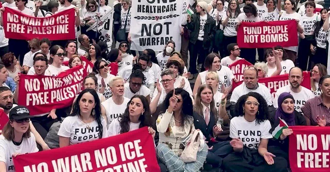​នគរបាលចាប់ខ្លួនអ្នកតវ៉ាប្រមាណ១០០នាក់នៅManhattan ជាអ្នកប្រឆាំងការលក់អាវុធរបស់សហរដ្ឋអាមេរិកទៅឲ្យអ៊ីស្រាអែល