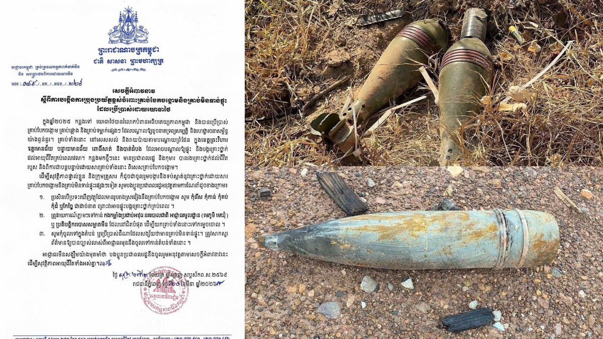 ​អាជ្ញាធរមីនអំពាវនាវឲ្យប្រជាពលរដ្ឋបង្កើនការប្រុងប្រយ័ត្នខ្ពស់ចំពោះគ្រាប់បែកចង្កោមនិងគ្រាប់មិនទាន់ផ្ទុះ ដែលប្រើប្រាស់ដោយយោធាថៃ