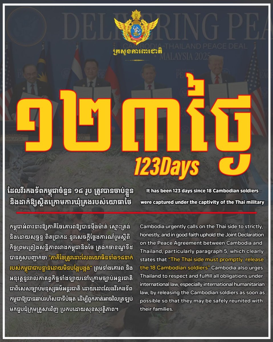 កម្ពុជាអំពាវនាវឱ្យភាគីថៃគោរពឱ្យបានម៉ឺងម៉ាត់ ស្មោះត្រង់ និងដោយសុច្ឆន្ទៈពិតប្រាកដ នូវសេចក្តីថ្លែងការណ៍រួមស្តីពីកិច្ចព្រមព្រៀងសន្តិភាពរវាងកម្ពុជានិងថៃ ត្រង់កថាខណ្ឌទី៥ បានគូសបញ្ជាក់ថា “ភាគីថៃត្រូវដោះលែងយោធិនទាំង១៨នាក់របស់កម្ពុជាជាបន្ទាន់ដោយមិនបង្អែបង្អង់” ព្រមទាំងគោរពនិងអនុវត្តនូវរាល់កាតព្វកិច្ចទាំងឡាយនៅក្រោមច្បាប់អន្តរជាតិ ជាពិសេសច្បាប់មនុស្សធម៌អន្តរជាតិ ដោយដោះលែងវីរកងទ័ពកម្ពុជាឱ្យបានឆាប់រហ័សជាទីបំផុត ដើម្បីពួកគាត់អាចវិលត្រឡប់មកជួបជុំក្រុមគ្រួសារវិញ ប្រកបដោយសុខសុវត្ថិភាព។ សូមគូសបញ្ជាក់ផងដែរថា រាជរដ្ឋាភិបាលកម្ពុជា បាននឹងកំពុងធ្វើការយ៉ាងសស្រាក់សស្រាំឥតឈប់ឈរ ដោយបានប្រើប្រាស់គ្រប់មធ្យោបាយនិងយន្តការដោះស្រាយទាំងអស់ ដើម្បីទាមទារឱ្យភាគីថៃដោះលែងវីរកងទ័ពរបស់យើងទាំង១៨នាក់នោះ ឱ្យបានឆាប់រហ័សជាទីបំផុត និងដោយសុខសុវត្ថិភាព។ រាជរដ្ឋាភិបាល ក្រសួងការពារជាតិ និងកងយោធពលខេមរភូមិន្ទ មិនដែលបោះបង់កងទ័ពរបស់យើងណាម្នាក់ចោលនោះឡើយ មិនថាក្នុងកាលៈទេសៈណាក៏ដោយ។