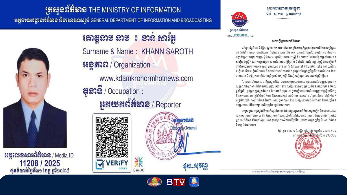 ​ក្រសួងព័ត៌មានលុបចោល និងហាមឃាត់មិនឱ្យធ្វើសកម្មភាពក្នុងវិស័យព័ត៌មានទៀតចំពោះបុគ្គលឈ្មោះ ខាន់ សារ័ត្ន ពាក់ព័ន្ធការអត្ថាធិប្បាយពាក្យសម្តីមិនសមរម្យលើរូបរាងកាយស្ត្រី