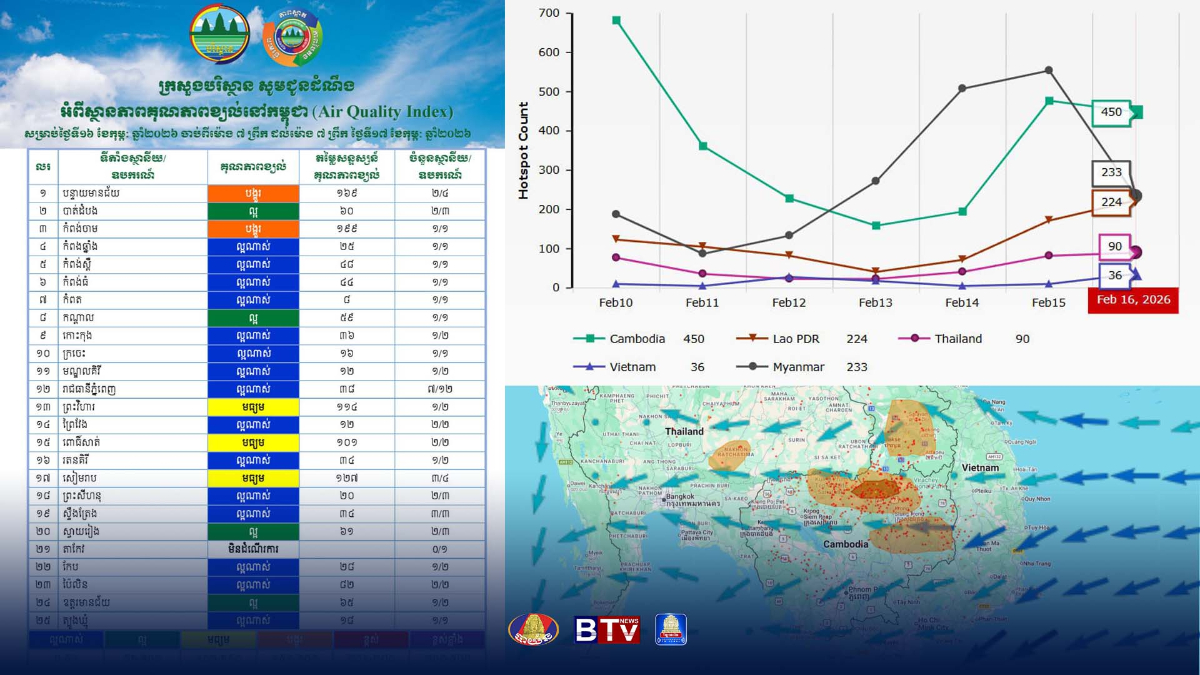 ស្ថានភាពគុណភាពខ្យល់គិតចាប់ពីម៉ោង ៧ព្រឹក ថ្ងៃទី១៦ ដល់ម៉ោង ៧ ព្រឹក ថ្ងៃទី១៧ ខែកុម្ភៈ ឆ្នាំ២០២៦ មានសន្ទស្សន៍គុណភាពខ្យល់ (Air Quality Index) “ល្អ”