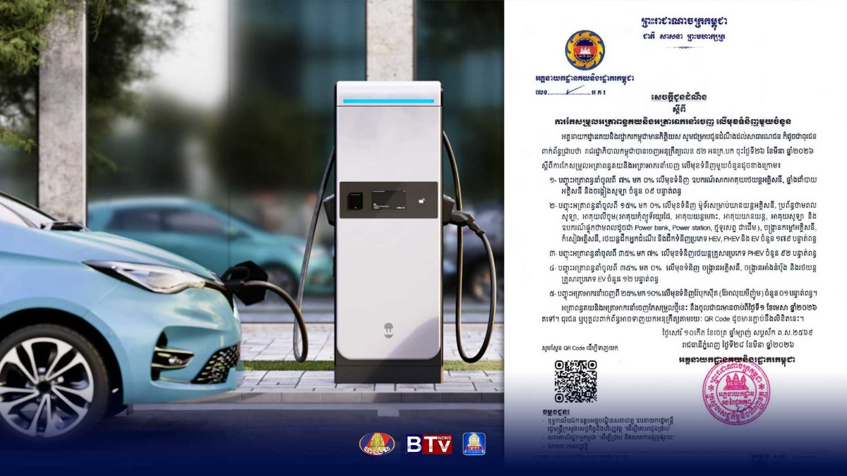 ភ្នំពេញ៖ រាជរដ្ឋាភិបាលកម្ពុជា សម្រេចបញ្ចុះអត្រាពន្ធគយ ​និង​អត្រាអាករនាំចេញ​ លើមុខ​ទំនិញមួយចំនួនរួមមាន ឧបករណ៍អគ្គិសនី, ប្រព័ន្ធសូឡា រថយន្តអគ្គិសនី ជាដើម។ នេះ​បើ​តាម​សេចក្តី​ជូនដំណឹងរបស់អគ្គនាយកដ្ឋានគយ និងរដ្ឋាករកម្ពុជាដែលទទួលបាននៅថ្ងៃទី២៩មីនានេះ។តាមសេចក្តីជូនដំណឹងស្តីពីការកែសម្រួលអត្រាពន្ធគយនិងអត្រាអាករនាំចេញ លើមុខទំនិញមួយចំនួន រួមមាន៖១- បញ្ចុះអត្រាពន្ធនាំចូលពី ៧% មក ០% លើមុខទំនិញ ឧបករណ៍សាកអាគុយរថយន្តអគ្គិសនី, ឆ្នាំងដាំបាយ អគ្គិសនី និងចង្កៀងសូឡា ចំនួន ០៩ បន្ទាត់ពន្ធ២- បញ្ចុះអត្រាពន្ធនាំចូលពី ១៥% មក ០% លើមុខទំនិញ ម៉ូទ័រសម្រាប់យានយន្តអគ្គិសនី, ប្រព័ន្ធថាមពល សូឡា, អាគុយលីចូម(អាគុយកុំព្យូទ័រយួរដៃ, អាគុយយន្តហោះ, អាគុយយានយន្ត, អាគុយសូឡា និង ឧបករណ៍ផ្ទុកថាមពលដូចជា Power bank, Power station, ថ្មទូរសព្ទ ជាដើម), ចង្ក្រានកម្ដៅអគ្គិសនី, កំសៀវអគ្គិសនី, រថយន្តដឹកអ្នកដំណើរ និងដឹកទំនិញប្រភេទ HEV, PHEV និង EV ចំនួន ១៧៩ បន្ទាត់ពន្ធ៣- បញ្ចុះអត្រាពន្ធនាំចូលពី ៣៥% មក ៧% លើមុខទំនិញរថយន្តគ្រួសារប្រភេទ PHEV ចំនួន ៩២ បន្ទាត់ពន្ធ៤- បញ្ចុះអត្រាពន្ធនាំចូលពី ៣៥% មក ០% លើមុខទំនិញ ចង្ក្រានអគ្គិសនី, ចង្ក្រានអាំងនំប៉័ង និងរថយន្ត គ្រួសារប្រភេទ EV ចំនួន ១២ បន្ទាត់ពន្ធ៥- បញ្ចុះអត្រាអាករនាំចេញពី ២៥% មក ១០% លើមុខទំនិញរ៉ែបុកស៊ីត (រ៉ែអាលុយមីញ៉ូម) ចំនួន ០១ បន្ទាត់ពន្ធ។