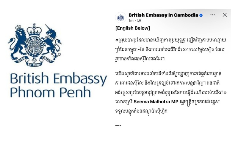 រដ្ឋមន្រ្តីការបរទេសអង់គ្លេសទទួលបន្ទុកឥណ្ឌូប៉ាស៊ីហ្វិច បង្ហាញការព្រួយបារម្ភចំពោះការស្លាប់ជនស៊ីវិលកម្ពុជាក្រោយយោធាកម្ពុជា-ថៃប៉ះទង្គិចគ្នាឡើងវិញ
