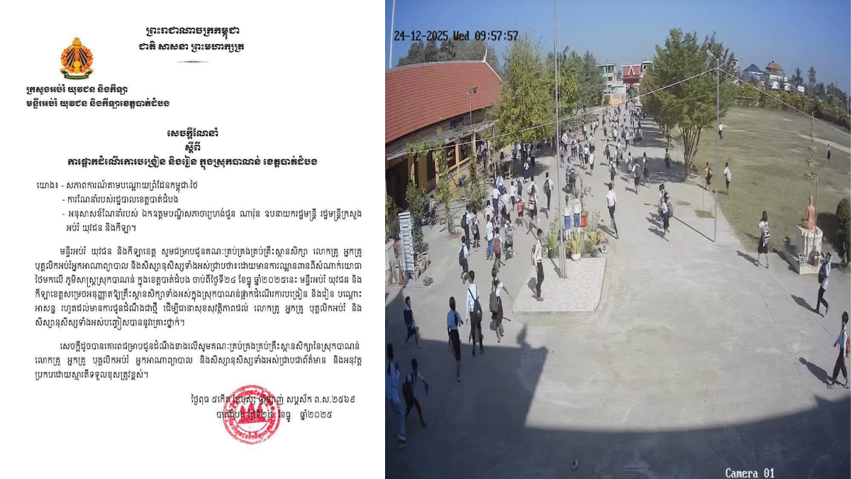 នៅថ្ងៃទី២៤ ខែធ្នូ ឆ្នាំ២០២៥ នេះ មន្ទីរអប់រំ យុវជន និងកីឡាខេត្តបាត់ដំបង បានចេញ សេចក្តីណែនាំ ស្តីពី ការផ្អាកដំណើរការបង្រៀន និងរៀន ក្នុងស្រុកបាណន់ ខេត្តបាត់ដំបង ជាបណ្ដោះអាសន្នមន្ទីរអប់រំ យុវជន និងកីឡាខេត្ត បានជម្រាបជូនគណៈគ្រប់គ្រងគ្រប់គ្រឹះស្ថានសិក្សា លោកគ្រូ អ្នកគ្រូ បុគ្គលិកអប់រំអ្នកអាណាព្យាបាល និងសិស្សានុសិស្សទាំងអស់ជ្រាបថា ដោយមានការឈ្លានពានពីសំណាក់យោធាថៃមកលើ ភូមិសាស្ត្រស្រុកបាណន់ ក្នុងខេត្តបាត់ដំបង ចាប់ពីថ្ងៃទី២៤ ខែធ្នូ ឆ្នាំ២០២៥នេះ មន្ទីរអប់រំ យុវជន និង កីឡាខេត្ត សម្រេចអនុញ្ញាតឱ្យគ្រឹះស្ថានសិក្សាទាំងអស់ក្នុង ស្រុកបាណន់ ផ្អាកដំណើរការបង្រៀន និងរៀន បណ្តោះអាសន្ន រហូតដល់មានការជូនដំណឹងជាថ្មី ដើម្បីធានាសុខសុវត្ថិភាពដល់ លោកគ្រូ អ្នកគ្រូ បុគ្គលិកអប់រំ និង សិស្សានុសិស្សទាំងអស់បញ្ចៀសបាននូវគ្រោះថ្នាក់។