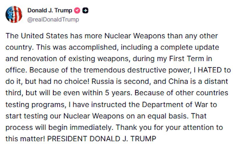 លោក Trump ប្រាប់មន្ទីរបញ្ចកោណ ឱ្យបន្តការសាកល្បងអាវុធនុយក្លេអ៊ែររបស់អាមេរិក ឡើងវិញភ្លាមៗ