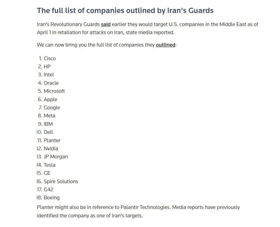 កងឆ្មាំបដិវត្តន៍អ៊ីរ៉ង់ (IRGC) បានព្រមានថាខ្លួននឹងកំណត់គោលដៅលើក្រុមហ៊ុនបច្ចេកវិទ្យាអាមេរិក ប្រសិនបើមេដឹកនាំអ៊ីរ៉ង់ជាច្រើនរូបទៀតត្រូវបានសម្លាប់នៅក្នុង «ការកំណត់គោលដៅធ្វើឃាត»។ សេចក្ដីថ្លែការណ៍របស់កងឆ្មាំបដិវត្តន៍បាននិយាយថា៖ «ក្រុមហ៊ុនទាំងនេះ ដោយចាប់ផ្តើមពីម៉ោង ៨:០០ យប់ ម៉ោងនៅទីក្រុងតេអេរ៉ង់ នៅថ្ងៃពុធ ទី១ ខែមេសា គួរតែរំពឹងថានឹងមានការបំផ្លាញអង្គភាពពាក់ព័ន្ធរបស់ពួកគេ ដោយសារការធ្វើឃាតនៅអ៊ីរ៉ង់» ដោយរាយបញ្ជីឈ្មោះក្រុមហ៊ុនចំនួន ១៨ស្ថាប័ន ដែលខ្លួនចោទប្រកាន់ថាបានជាប់ពាក់ព័ន្ធក្នុងការសម្លាប់មន្ត្រីអ៊ីរ៉ង់។
