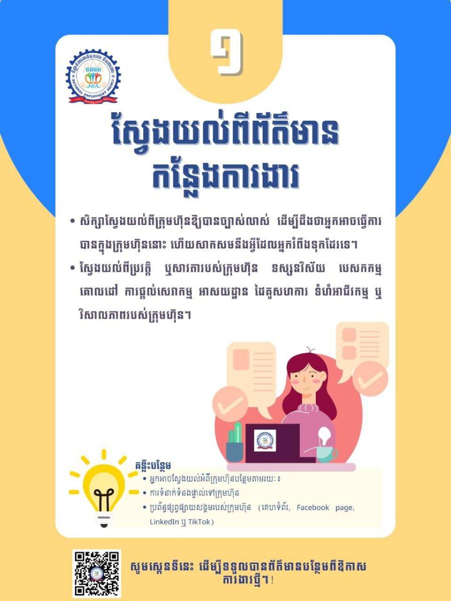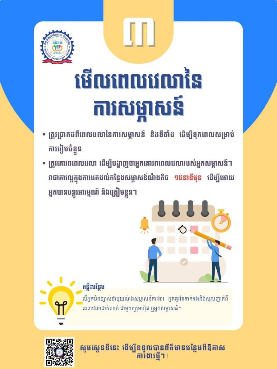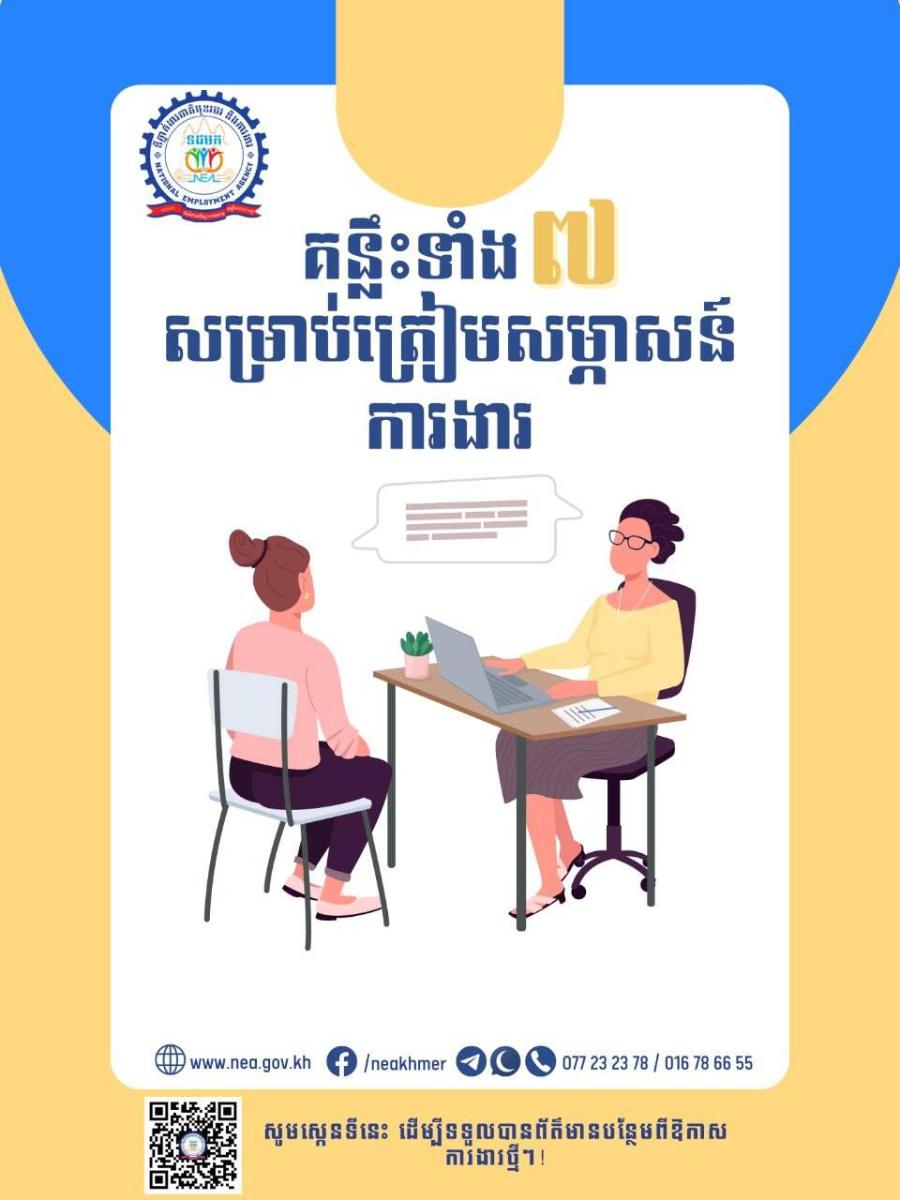 ខណៈដែលឱកាសការងារជាច្រើនបានកំពុងប្រកាសតម្រូវការកម្លាំងពលកម្មលើគ្រប់វិស័យ ទីភ្នាក់ងារជាតិមុខរបរ និងការងារ ហៅកាត់ NEA នៃក្រសួងការងារ និងបណ្តុះបណ្តាលវិជ្ជាជីវៈ បានចែករំលែកគន្លឹះសំខាន់ៗចំនួន៧យ៉ាង សម្រាប់ការត្រៀមខ្លួនសម្ភាសការងារប្រកបដោយជោគជ័យ។