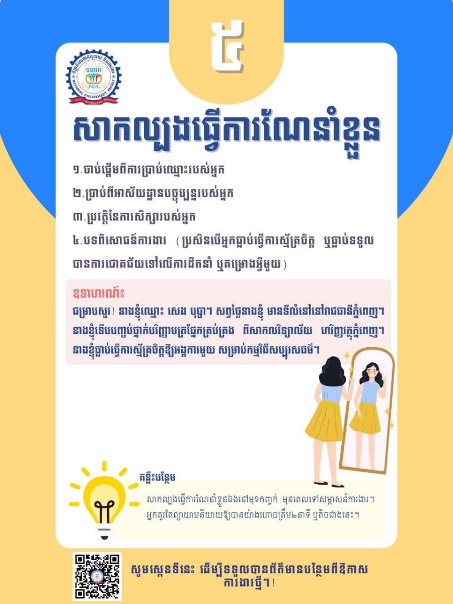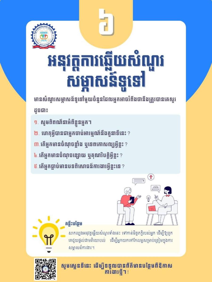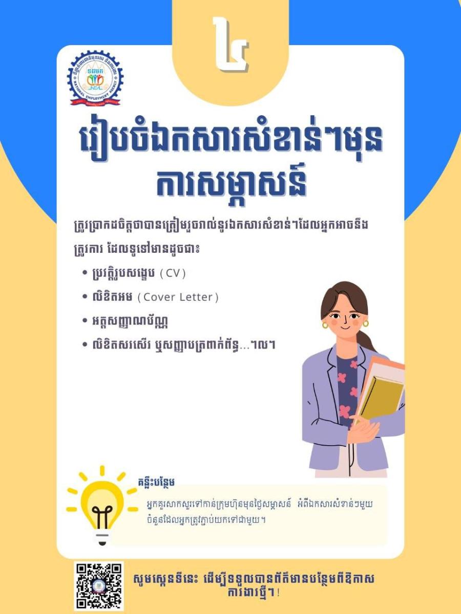 ខណៈដែលឱកាសការងារជាច្រើនបានកំពុងប្រកាសតម្រូវការកម្លាំងពលកម្មលើគ្រប់វិស័យ ទីភ្នាក់ងារជាតិមុខរបរ និងការងារ ហៅកាត់ NEA នៃក្រសួងការងារ និងបណ្តុះបណ្តាលវិជ្ជាជីវៈ បានចែករំលែកគន្លឹះសំខាន់ៗចំនួន៧យ៉ាង សម្រាប់ការត្រៀមខ្លួនសម្ភាសការងារប្រកបដោយជោគជ័យ។