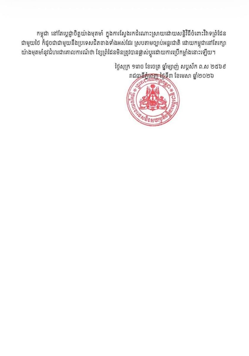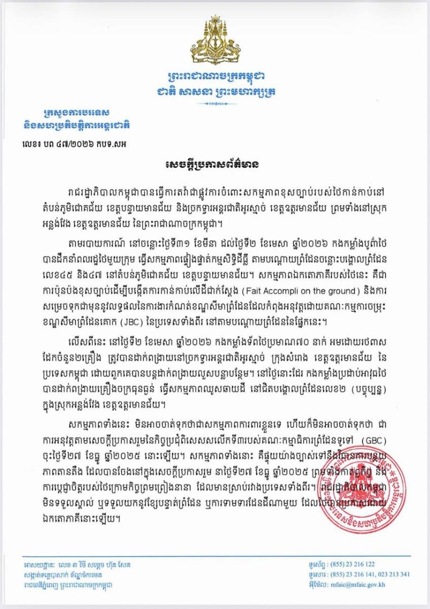 សកម្មភាពទាំងនេះ មិនអាចចាត់ទុកថាជាសកម្មភាពការពារខ្លួនទេ ហើយក៏មិនអាចចាត់ទុកថា ជាការអនុវត្តតាមសេចក្តីប្រកាសរួមនៃកិច្ចប្រជុំពិសេសសលើកទី៣របស់គណៈកម្មាធិការព្រំដែនទូទៅ (GBC) ចុះថ្ងៃទី២៧ ខែធ្នូ ឆ្នាំ២០២៥ នោះឡើយ។ សកម្មភាពទាំងនោះ គឺផ្ទុយយ៉ាងច្បាស់ទៅនឹងវិធានការបន្ថយភាពតានតឹង ដែលបានចែងនៅក្នុងសេចក្តីប្រកាសរួម នាថ្ងៃទី២៧ ខែធ្នូ ឆ្នាំ២០២៥ ព្រមទាំងការការប្តេជ្ញាចិត្តរបស់ថៃក្រោមកិច្ចព្រមព្រៀងនានា ដែលមានស្រាប់រវាងប្រទេសទាំងពីរ។ រាជរដ្ឋាភិបាលកម្ពុជា មិនទទួលស្គាល់ ឬទទួលយកនូវខ្សែបន្ទាត់ព្រំដែន ឬការទាមទារដែនដីណាមួយដែលថៃបានប្រកាសដោយឯកតោភាគីនោះឡើយ។