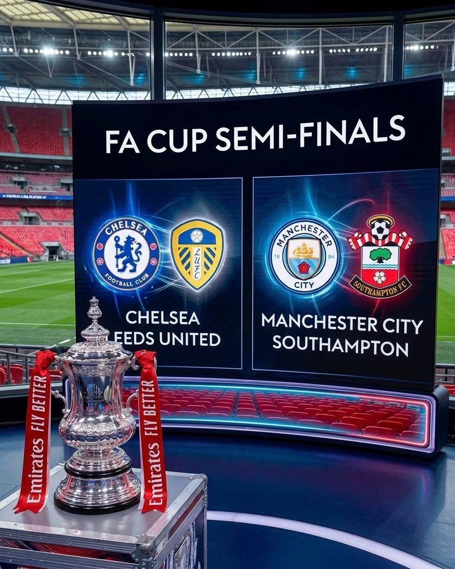 ការប្រកួតបាល់ទាត់ពានរង្វាន់ FA Cup អង់គ្លេសរកបានបួនក្រុមឡើងវគ្គពាក់កណ្តាលផ្តាច់ព្រ័ត្រហើយរួមមាន Leeds United, Chelsea, Manchester City និង Southampton ។