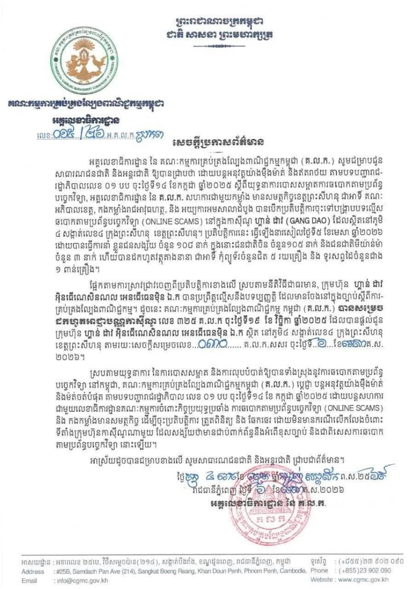 អគ្គលេខាធិការដ្ឋាន នៃ គណៈកម្មការគ្រប់គ្រងល្បែងពាណិជ្ជកម្មកម្ពុជា (គ.ល.ក.) បានឲ្យដឹងថា ដោយបន្តអនុវត្តយ៉ាងម៉ឺងម៉ាត់ និងឥតរាថយ តាមបទបញ្ជារាជរដ្ឋាភិបាលលេខ ០១ បប ចុះថ្ងៃទី១៤ ខែកក្កដា ឆ្នាំ២០២៥ ស្តីពីយុទ្ធនាការបោសសម្អាតការឆបោកតាមប្រព័ន្ធ បច្ចេកវិទ្យា, អគ្គលេខាធិការដ្ឋាន នៃ គ.ល.ក. សហការជាមួយកម្លាំង មានសមត្ថកិច្ចខេត្តព្រះសីហនុ ជាអាទិ៍ គណៈ អភិបាលខេត្ត, កងកម្លាំងរាជអាវុធហត្ថ, និង អយ្យការអមសាលាដំបូង បានបើកប្រតិបត្តិការចុះទៅបង្ក្រាបបទល្មើស ឆបោកតាមប្រព័ន្ធបច្ចេកវិទ្យា (ONLINE SCAMS) នៅក្នុងកាស៊ីណូ ហ្គាន់ ដាវ (GANG DAO) ដែលស្ថិតនៅភូមិ ៤ សង្កាត់លេខ៤ ក្រុងព្រះសីហនុ ខេត្តព្រះសីហនុ។