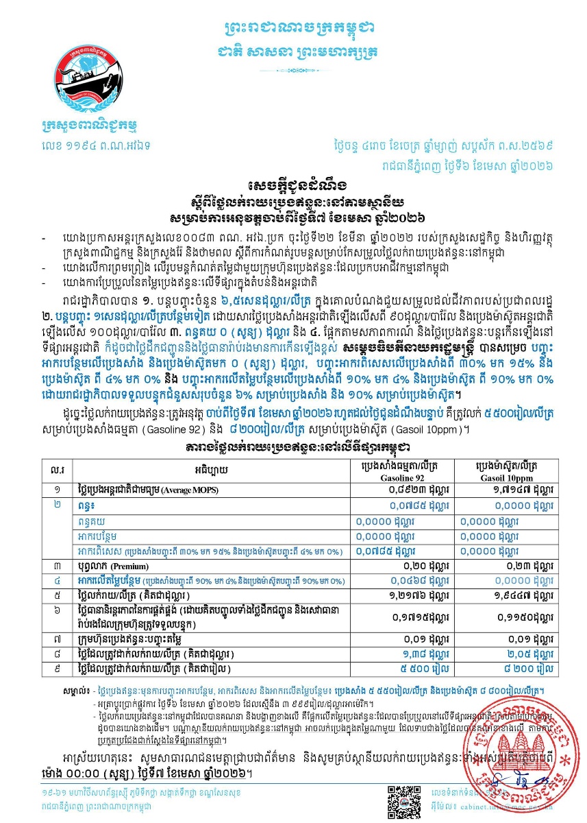 ថ្លៃលក់រាយប្រេងឥន្ធនៈនៅតាមស្ថានីយ សម្រាប់ការអនុវត្តចាប់ពីថ្ងៃទី៧ ខែមេសា ឆ្នាំ២០២៦ រហូតដល់ថ្ងៃជូនដំណឹងបន្ទាប់ គឺត្រូវលក់ ៥ ៥០០រៀល/លីត្រ សម្រាប់ប្រេងសាំងធម្មតា (Gasoline 92) និង ៨២០០រៀល/លីត្រ សម្រាប់ប្រេងម៉ាស៊ូត (Gasoil 10ppm)។