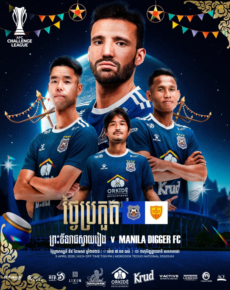 ក្រុមព្រះខ័នរាជស្វាយរៀង របស់កម្ពុជា នឹងត្រូវបើកទ្វារផ្ទះទទួលក្រុមក្រុម Manila Digger FC របស់ហ្វីលីពីន នៅក្នុងវគ្គពាក់កណ្ដាលផ្ដាច់ព្រ័ត្រ-ជើងទី១ នៃពានរង្វាន់ក្លិបបាល់ទាត់កម្រិតទី៣ ទ្វីបអាស៊ី AFC Challenge League 2025/26 នាវេលាម៉ោង ៧យប់ថ្ងៃទី៩ ខែមេសា ឆ្នាំ២០២៦ នេះ នៅពហុកីឡដ្ឋានជាតិមរតកតេជោ រាជធានីភ្នំពេញ។