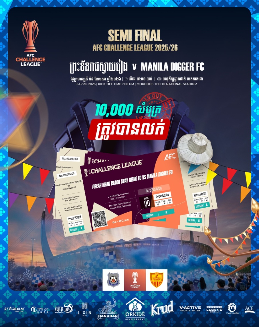 គិតត្រឹមថ្ងៃទី៩ ខែមេសា ត្រូវនឹងថ្ងៃប្រកួតជើងទី២ រវាងក្រុមខ្លាំងកម្ពុជា និងហ្វីលីពីននេះដែរ ជំនួបដ៏ទាក់ទាញនេះ បានលក់សំបុត្រអស់ប្រមាណជាង ១ម៉ឺនសំបុត្រហើយ ខណៈអ្នកគាំទ្រអាចបន្ដទិញបាន ដោយក្លិបព្រះខ័នរាជស្វាយរៀង បន្ដលក់តាម Online និងមានលក់ផ្ទាល់នៅពហុកីឡដ្ឋានជាតិមរតកតេជោ ក្នុងតម្លៃ ៨ពាន់រៀលប៉ុណ្ណោះ៕ អត្ថបទ លី ឈុនឡា