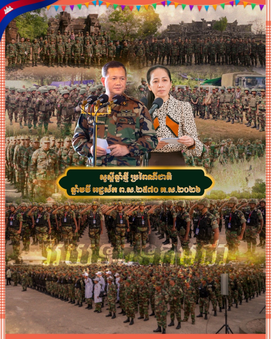 ក្នុងឱកាសបុណ្យចូលឆ្នាំថ្មី ប្រពៃណីជាតិ ឆ្នាំមមី អដ្ឋស័ក ព.ស.២៥៧០ គ.ស.២០២៦ យើងខ្ញុំសូមលើកហត្ថបួងសួងដល់បារមីវត្ថុស័ក្តិសិទ្ធិទាំងឡាយក្នុងលោក ជាពិសេសទេវតាឆ្នាំថ្មី ព្រះនាម «រាក្យសាទេវី» សូមមេត្តាតាមជួយថែរក្សា ការពារ និងប្រោះព្រំសព្ទសាធុការពរជ័យ សិរីមង្គល បវរមហាប្រសើរជូន វីរយុទ្ធជនជួរមុខគ្រប់ៗរូបដែលជាដង្ហើមនៃសន្តិភាព សូមឱ្យជួបតែសេចក្តីសុខសុភមង្គល មានសុខភាពល្អមាំមួន កាយពលខ្លាំងក្លា មានសុវត្ថិភាពពេញលេញ ចៀសចាកឆ្ងាយពីសត្រូវគ្រប់ទិសទី និងសូមជួបតែពុទ្ធពរទាំង៤ប្រការគឺ អាយុ វណ្ណៈ សុខៈ ពលៈ កុំបីឃ្លៀងឃ្លាតឡើយ ៕