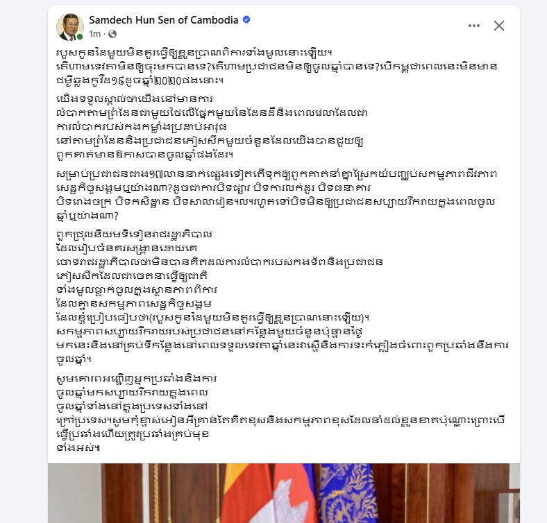សម្ដេចបានថ្លែងថា សម្រាប់ប្រជាជនជាង ១៧លាននាក់ផ្សេងទៀត តើទុកឲ្យពួកគាត់នាំគ្នាស្រែកយំបញ្ឈប់សកម្មភាពជីវភាពសេដ្ឋកិច្ចសង្គម ឬយ៉ាងណា? ដូចជាការបិទផ្សារ បិទការលក់ដូរ បិទធនាគារ បិទរោងចក្រ បិទកសិដ្ឋាន បិទសាលារៀន។ល។ រហូតទៅបិទមិនឲ្យប្រជាជនសប្បាយរីករាយក្នុងពេលចូលឆ្នាំឬយ៉ាងណា?