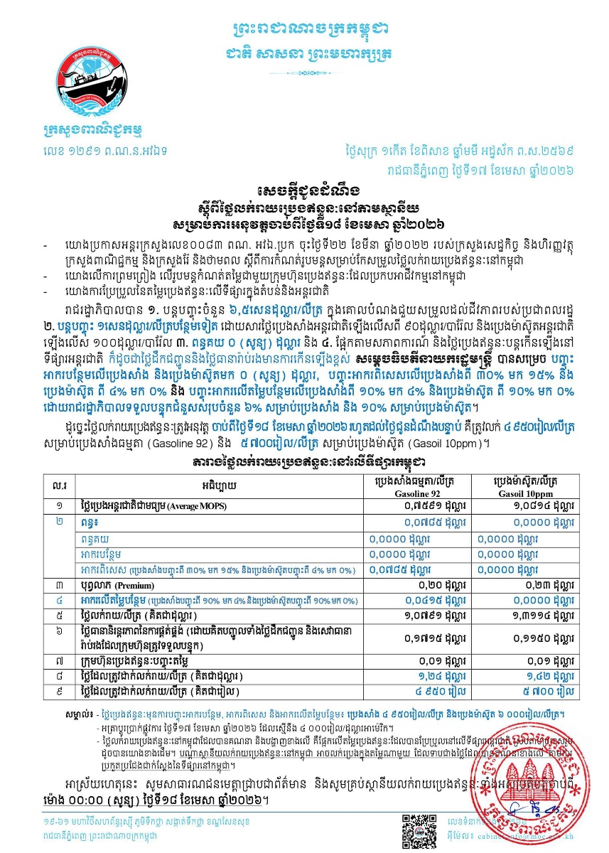 ភ្នំពេញ៖ បើតាមសេចក្ដីជូនដំណឹងរបស់ក្រសួងពាណិជ្ជកម្ម នៅថ្ងៃទី១៨ ខែមេសា ឆ្នាំ២០២៦នេះ ថ្លៃលក់រាយប្រេងឥន្ធនៈនៅតាមស្ថានីយ សម្រាប់ការអនុវត្តចាប់ពីម៉ោង ០០:០០ (សូន្យ) ថ្ងៃទី១៨ ខែមេសា ឆ្នាំ២០២៦ រហូតដល់ថ្ងៃជូនដំណឹងបន្ទាប់ ក្នុងនោះ ប្រេងសាំង ៤ ៩៥០ រៀល/លីត្រ និង ប្រេងម៉ាស៊ូត ៥ ៧០០ រៀល/លីត្រ។