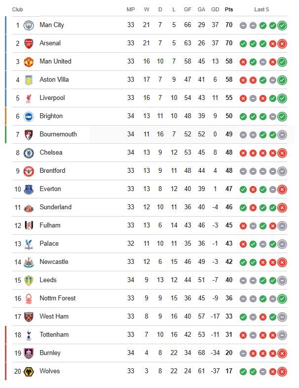 ក្រោយ ៣៣ ប្រកួតនៅពេលនេះ Manchester City និង Arsenal កំពុងមាន ៧០ ពិន្ទុស្មើគ្នាតែ City នៅពីលើដោយមានគ្រាប់បាល់ស៊ុតបញ្ចូលទីគូប្រកួតច្រើនជាង។