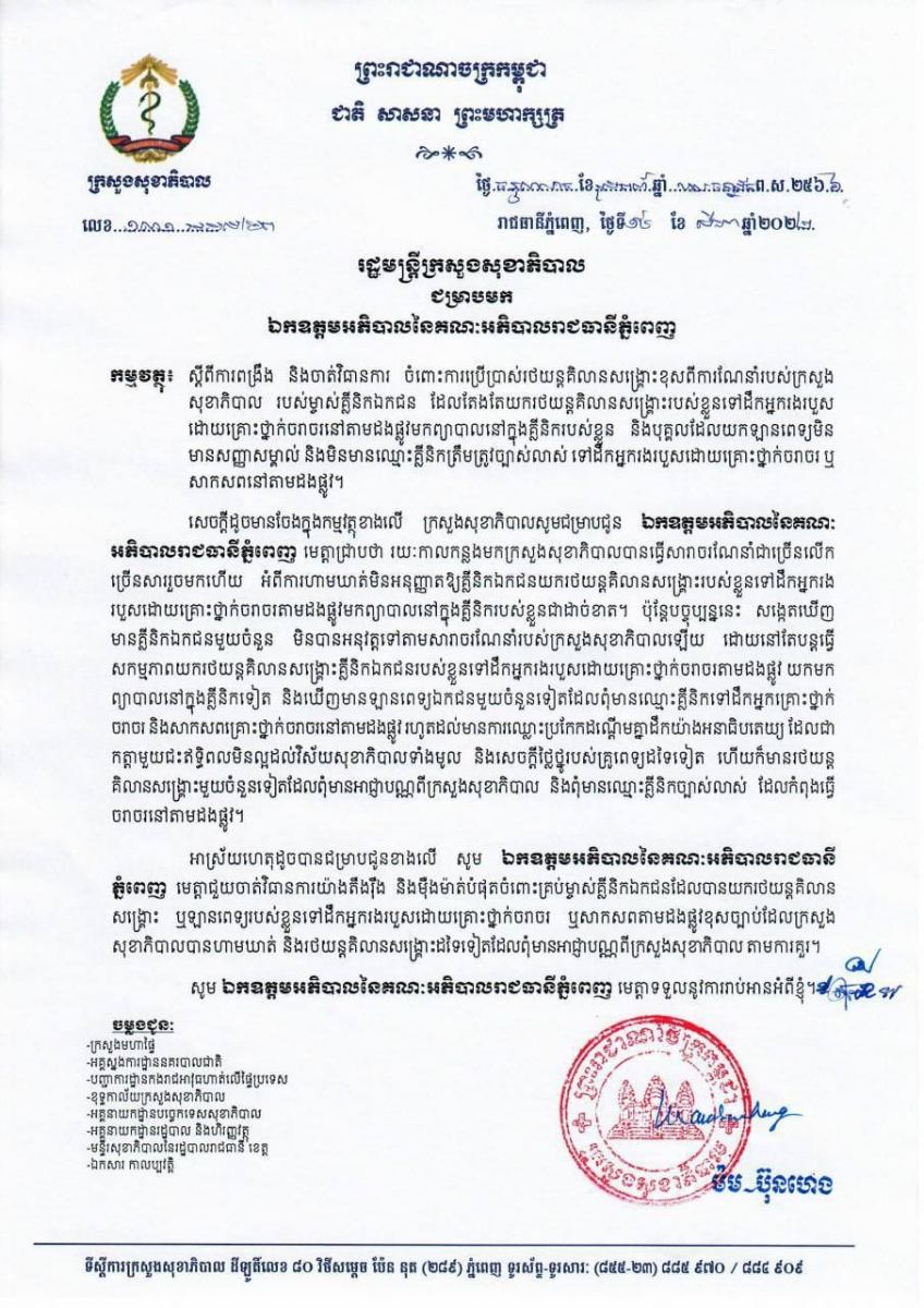 យោងតាមលិខិតរបស់ឯកឧត្តម ម៉ម ប៊ុនហេង រដ្ឋមន្ត្រីក្រសួងសុខាភិបាល នៅថ្ងៃទី១៥ ខែសីហា ឆ្នាំ២០២២នេះ បានឱ្យដឹងថា រយៈកាលកន្លងមកក្រសួងសុខាភិបាល បានធ្វើសារាចរណែនាំជាច្រើនលើកច្រើនសាររួចមកហើយ អំពីការហាមឃាត់មិនអនុញ្ញាត ឱ្យគ្លីនិកឯកជន យករថយន្តគិលានសង្គ្រោះ របស់ខ្លួនទៅដឹកអ្នករងរបួស ដោយគ្រោះថ្នាក់ចរាចរតាមដងផ្លូវមកព្យាបាល នៅក្នុងគ្លីនិករបស់ខ្លួនជាដាច់ខាត។
