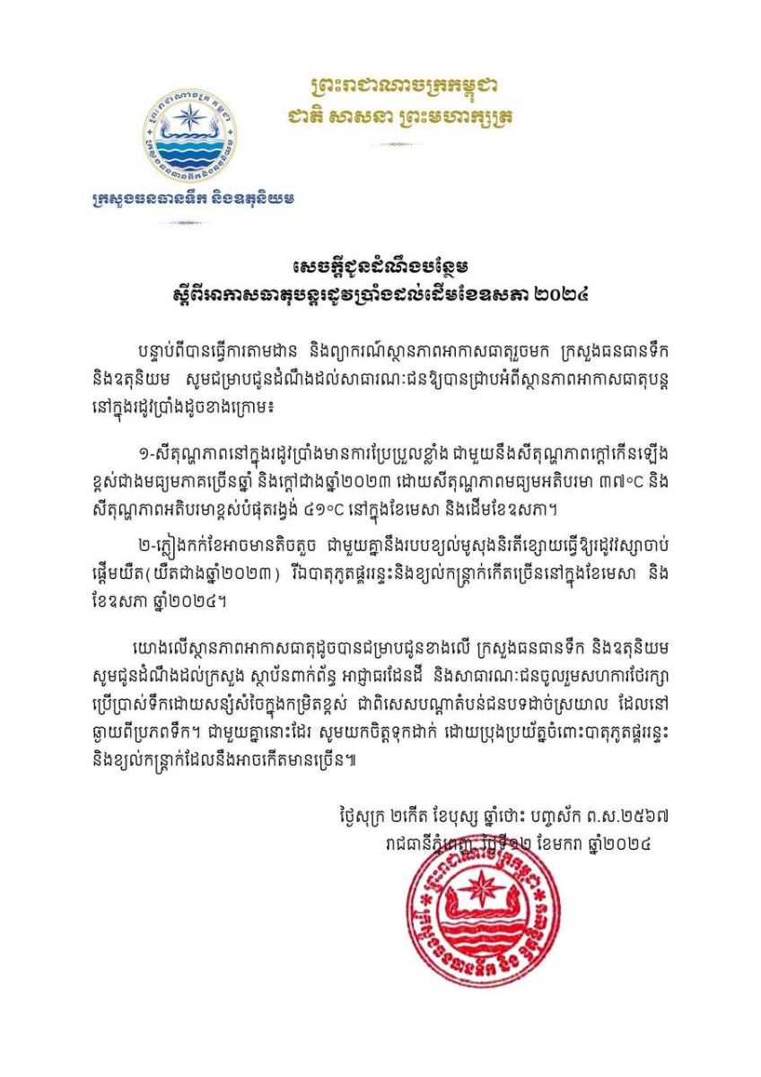 ភ្នំពេញ៖ តាមរយៈសេចក្តីជូនដំណឹងរបស់ក្រសួងធនធានទឹក និងឧតុនិយម ចេញផ្សាយនៅថ្ងៃទី១២ ខែមករា ឆ្នាំ២០២៤នេះ បានឲ្យដឹងថា បន្ទាប់ពីបានធ្វើការតាមដាន និងព្យាករណ៍ស្ថានភាពអាកាសធាតុរួចមក ក្រសួងធនធានទឹក និងឧតុនិយម សូមជម្រាបជូនដំណឹងដល់សាធារណៈជនឱ្យបានជ្រាបអំពីស្ថានភាពអាកាសធាតុបន្តនៅក្នុងរដូវប្រាំងដូចខាងក្រោម៖
