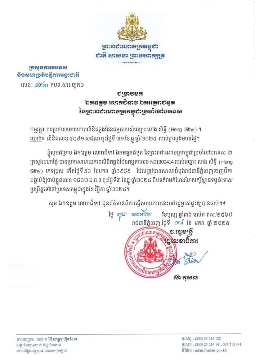 ក្រសួងការបរទេស និងសហប្រតិបត្តិការអន្តរជាតិ កាលពីថ្ងៃទី៨ ខែមករា ឆ្នាំ២០២៥ បានផ្ញើលិខិតទៅកាន់ឯកអគ្គរាជទូតនៃព្រះរាជាណាចក្រកម្ពុជាប្រចាំនៅបរទេស ថា ក្រសួងមហាផ្ទៃ បានប្រកាសមោឃភាពលិខិតឆ្លងដែនធម្មតាលេខ NO1309414 របស់ឈ្មោះ ហេង សិទ្ធី (Heng Sithy) ភេទប្រុស កើតថ្ងៃទី២៦ ខែមករា ឆ្នាំ១៩៨៩ ដែលត្រូវបានសាលាដំបូងរាជធានីភ្នំពេញចេញដីកាបង្គាប់ឱ្យចាប់ខ្លួនលេខ ១៨០២ ដ.ច.ន ចុះថ្ងៃទី៣ ខែធ្នូ ឆ្នាំ២០២៤ ពីបទគំរាមកំហែងហែកកេរ្តិ៍មានស្ថានទម្ងន់ទោស ប្រព្រឹត្តនៅប្រទេសកម្ពុជាក្នុងខែវិច្ឆិកា ឆ្នាំ២០២៤។