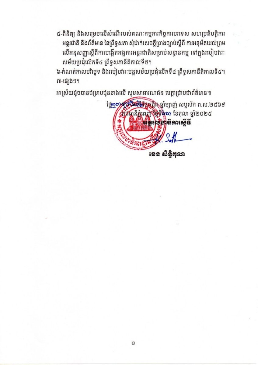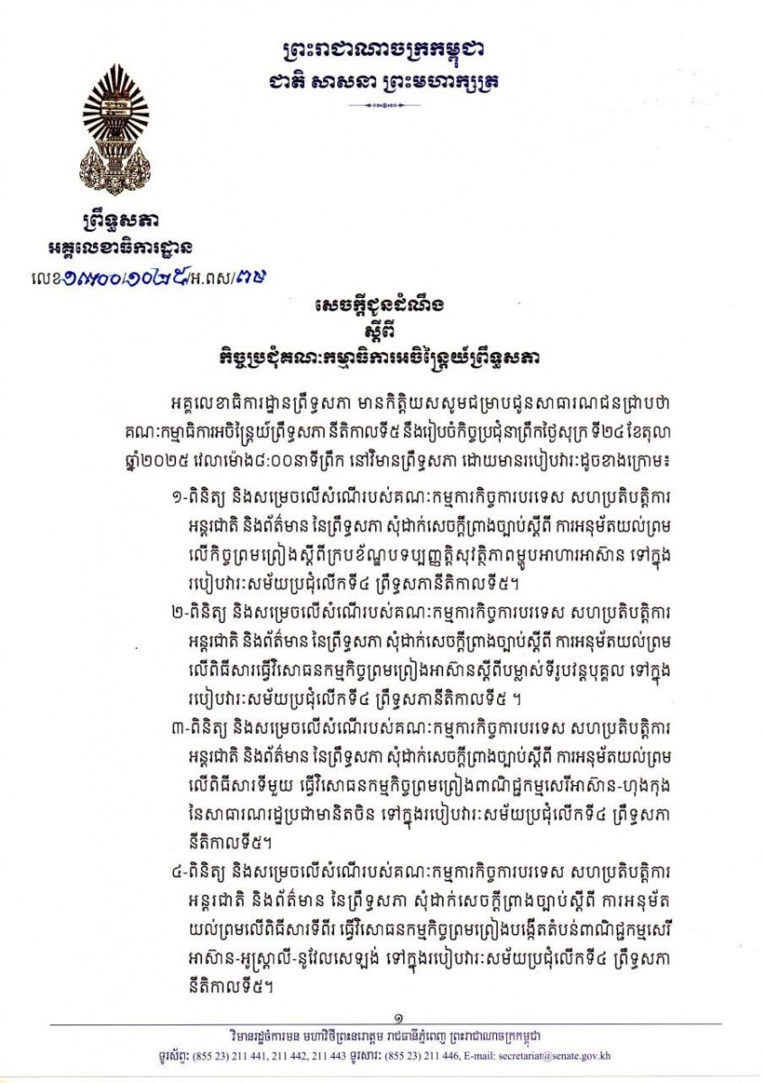 សេចក្តីជូនដំណឹង ដែលបានចេញនៅព្រឹកថ្ងៃទី២៣ ខែតុលា ឆ្នាំ២០២៥នេះ បានបញ្ជាក់ថា របៀបវារៈទាំង៥នោះរួមមាន១-ពិនិត្យ និងសម្រេចលើសំណើរបស់គណៈកម្មការកិច្ចការបរទេស សហប្រតិបត្តិការ អន្តរជាតិ និងព័ត៌មាន នៃព្រឹទ្ធសភា សុំដាក់សេចក្តីព្រាងច្បាប់ស្តីពី ការអនុម័តយល់ព្រម លើកិច្ចព្រមព្រៀងស្តីពីក្របខ័ណ្ឌបទប្បញ្ញត្តិសុវត្ថិភាពម្ហូបអាហារអាស៊ាន ទៅក្នុង របៀបវារៈសម័យប្រជុំលើកទី៤ ព្រឹទ្ធសភានីតិកាលទី៥។ ២-ពិនិត្យ និងសម្រេចលើសំណើរបស់គណៈកម្មការកិច្ចការបរទេស សហប្រតិបត្តិការ អន្តរជាតិ និងព័ត៌មាន នៃព្រឹទ្ធសភា សុំដាក់សេចក្ដីព្រាងច្បាប់ស្តីពី ការអនុម័តយល់ព្រម លើពិធីសារធ្វើវិសោធនកម្មកិច្ចព្រមព្រៀងអាស៊ានស្តីពីបម្លាស់ទីរូបវន្តបុគ្គល ទៅក្នុង របៀបវារៈសម័យប្រជុំលើកទី៤ ព្រឹទ្ធសភានីតិកាលទី៥ ។