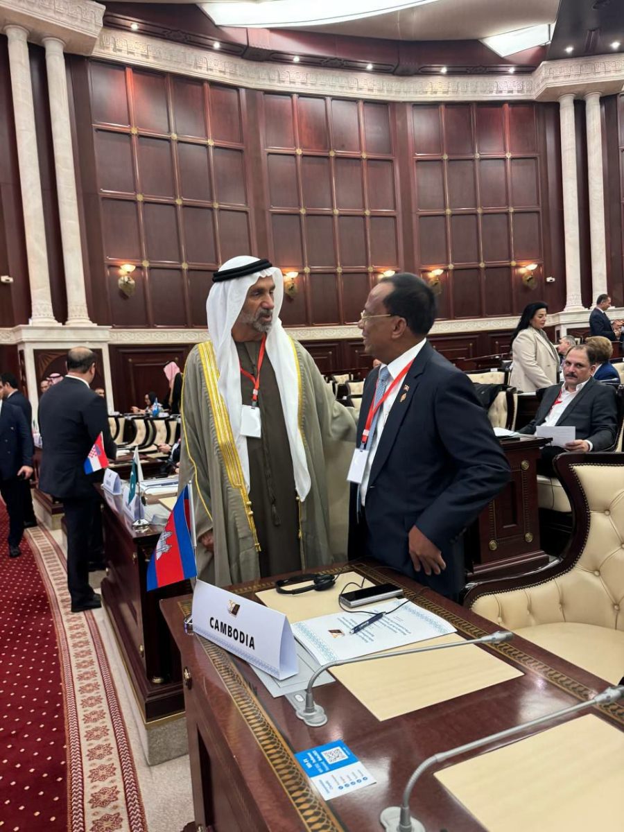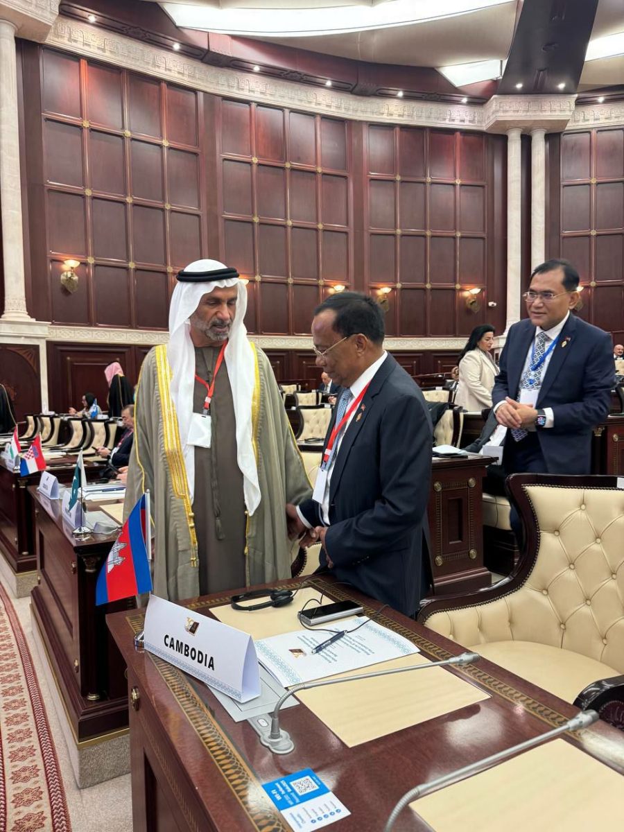 ក្នុងនាមរដ្ឋសភាកម្ពុជា ឯកឧត្តមបានអរគុណ ឯកឧត្តម Ahmed Aljarwan ដែលបានគាំទ្រសភាកម្ពុជា ធ្វើជាម្ចាស់ផ្ទះនៃកិច្ចប្រជុំពេញអង្គលើកទី១១ នៃសភាអន្តរជាតិដើម្បីសន្តិភាព និងភាពអត់ឱន កាលពីឆ្នាំ២០២៤ កន្លងទៅ ដោយទទួលបានសមិទ្ធផលយ៉ាងល្អប្រសើរ នោះគឺ "ធម្មនុញ្ញសន្តិភាព សកល" និងជាពិសេសបានប្រគល់មេដាយសន្តិភាព ជូនសម្តេចអគ្គមហាសេនាបតីតេជោ ហ៊ុន សែន ប្រធានព្រឹទ្ធសភា ថែមទៀតផង។