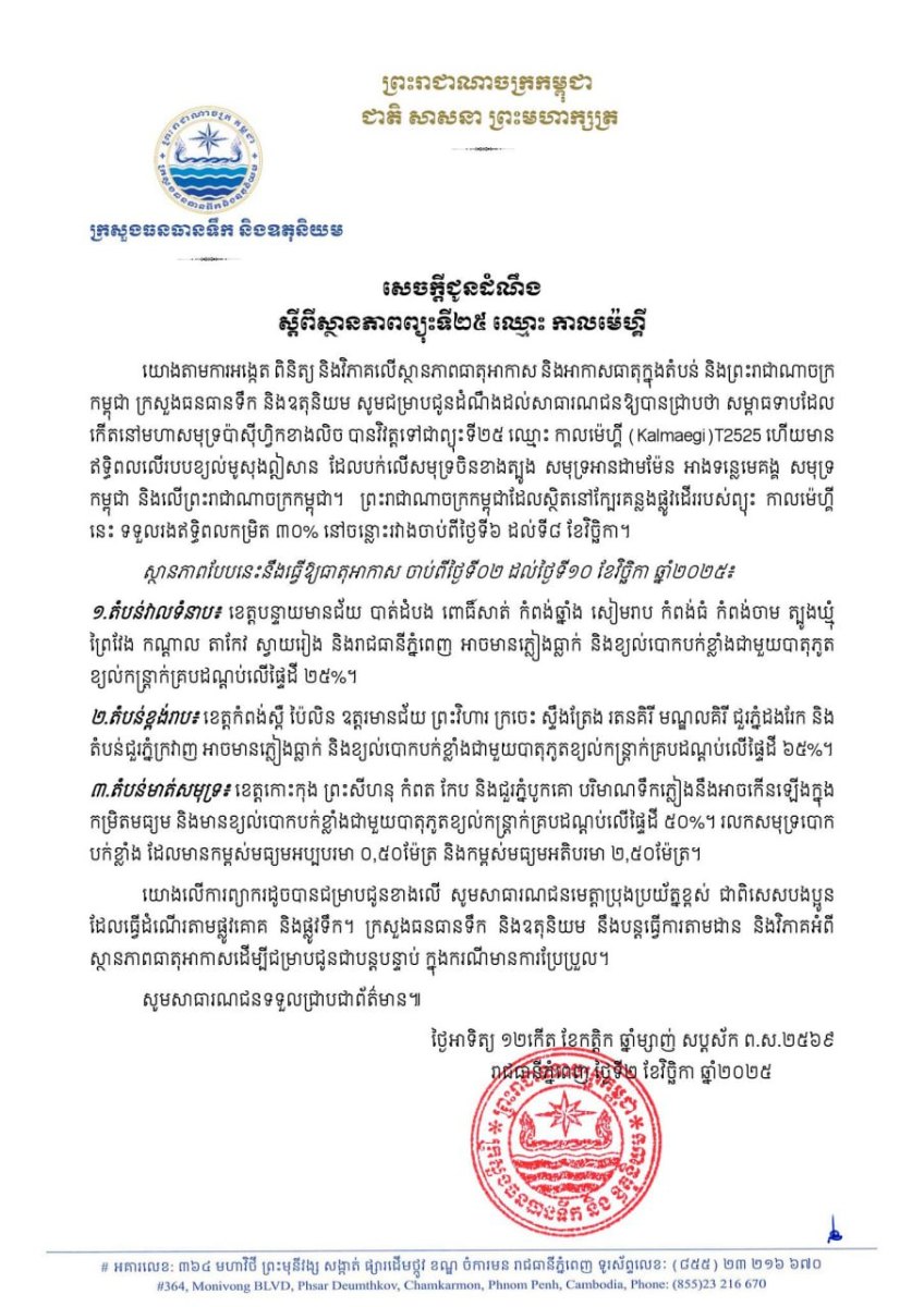 សម្ពាធទាបដែលកើតនៅមហាសមុទ្រប៉ាស៊ីហ្វិកខាងលិច បានវិវត្តទៅជាព្យុះទី២៥ ឈ្មោះ កាលម៉េហ្គី (Kalmaegi)T2525 ហើយមានឥទ្ធិពលលើរបបខ្យល់មូសុងឦសាន ដែលបក់លើសមុទ្រចិនខាងត្បូង សមុទ្រអានដាមម៉ែន អាងទន្លេមេគង្គ សមុទ្រកម្ពុជា និងលើព្រះរាជាណាចក្រកម្ពុជា។ ព្រះរាជាណាចក្រកម្ពុជាដែលស្ថិតនៅក្បែរគន្លងផ្លូវដើររបស់ព្យុះ កាលម៉េហ្គី នេះ ទទួលរងឥទ្ធិពលកម្រិត ៣០% នៅចន្លោះរវាងចាប់ពីថ្ងៃទី៦ ដល់ទី៨ ខែវិច្ឆិកា។ នេះបើយោងតាមសេចក្ដីជូនដំណឹងរបស់ក្រសួងធនធានទឹក និងឧតុនិយម។