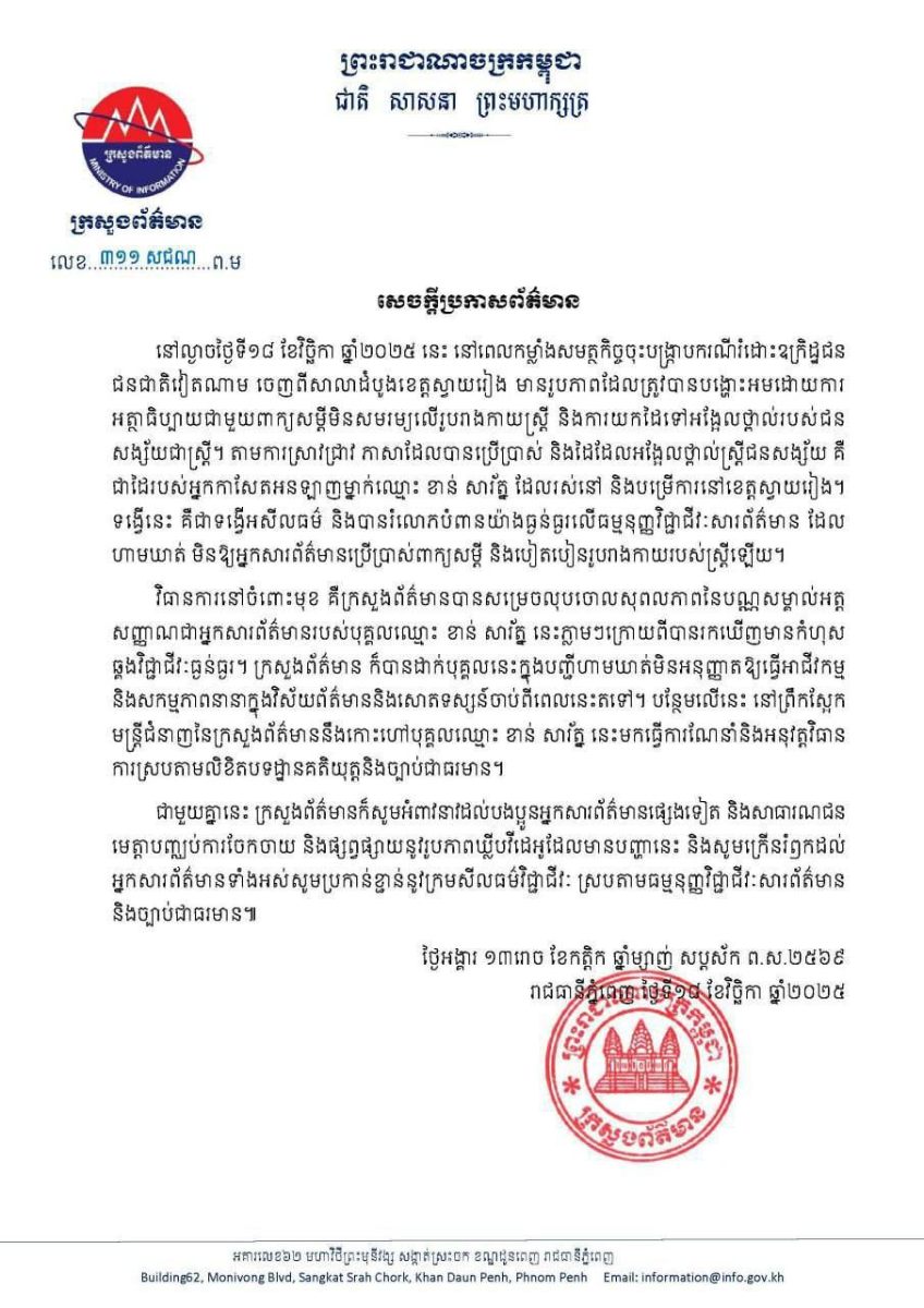 នៅល្ងាចថ្ងៃទី១៨ ខែវិច្ឆិកា ឆ្នាំ២០២៥ នេះ នៅពេលកម្លាំងសមត្ថកិច្ចចុះបង្ក្រាបករណីរំដោះឧក្រិដ្ឋជនជនជាតិវៀតណាម ចេញពីសាលាដំបូងខេត្តស្វាយរៀង មានរូបភាពដែលត្រូវបានបង្ហោះអមដោយការអត្ថាធិប្បាយជាមួយពាក្យសម្តីមិនសមរម្យលើរូបរាងកាយស្ត្រី និងការយកដៃទៅអង្អែលថ្ពាល់របស់ជនសង្ស័យជាស្ត្រី។ តាមការស្រាវជ្រាវ ភាសាដែលបានប្រើប្រាស់ និងដៃដែលអង្អែលថ្ពាល់ស្ត្រីជនសង្ស័យ គឺជាដៃរបស់អ្នកកាសែតអនឡាញម្នាក់ឈ្នោះ ខាន់ សារ័ត្ន ដែលរស់នៅនិងបម្រើការនៅខេត្តស្វាយរៀង។ ទង្វើនេះជាទង្វើខ្វះសីលធម៌ និងបានរំលោភបំពានយ៉ាងធ្ងន់ធ្ងរលើធម្មនុញ្ញវិជ្ជាជីវៈសារព័ត៌មាន ដែលហាមឃាត់ មិនឱ្យអ្នកសារព័ត៌មានប្រើប្រាស់ពាក្យសម្តី និងបៀតបៀនរូបរាងកាយរបស់ស្ត្រីឡើយ។ នេះបើយោងតាមសេចក្ដីប្រកាសព័ត៌មាន។