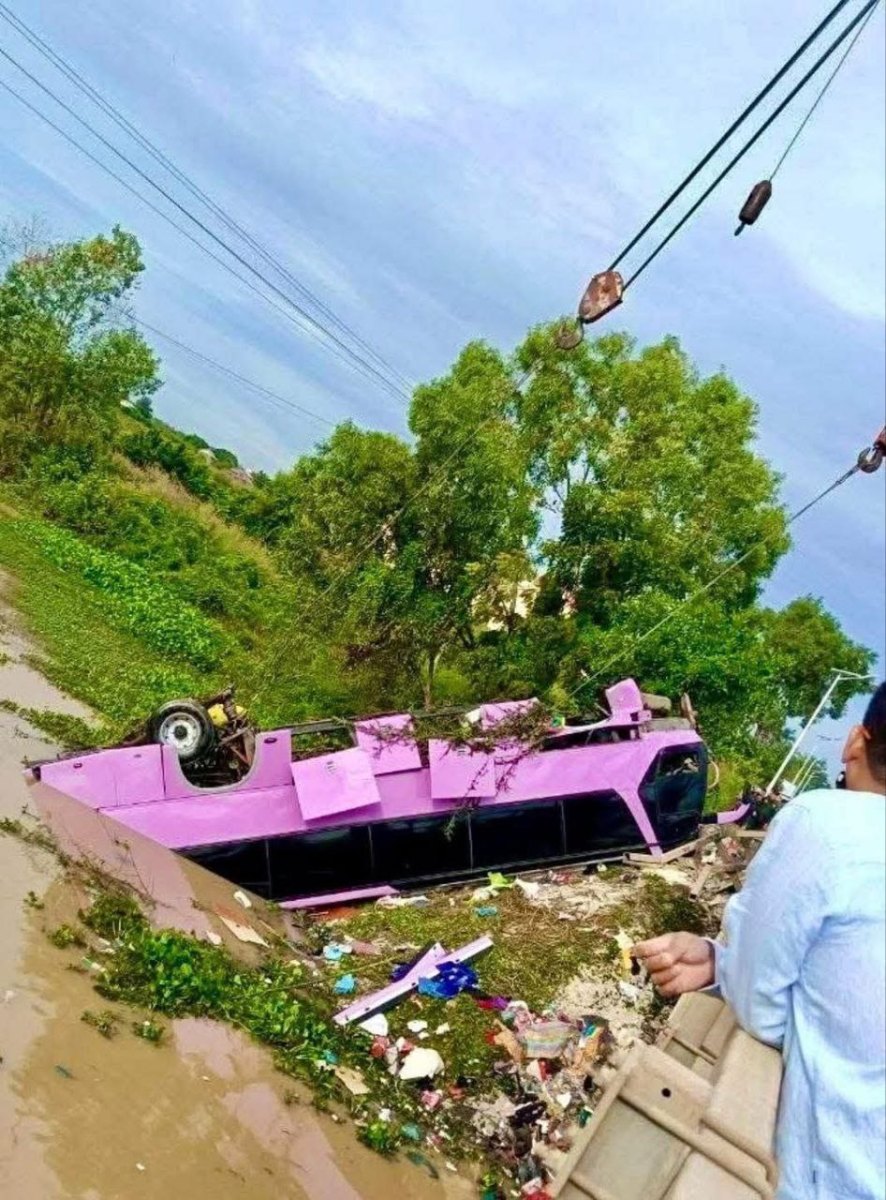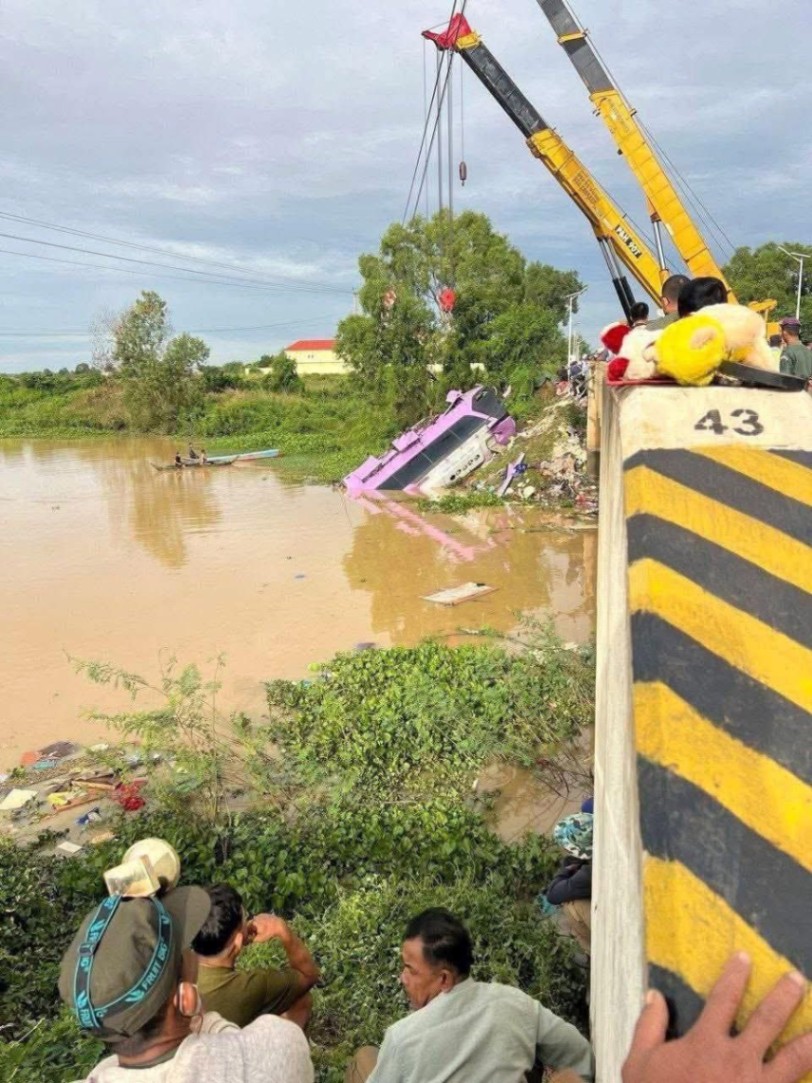 កំពង់ធំ៖ រថយន្ដក្រុងដឹកអ្នកដំណើរពេលយប់មួយគ្រឿង បានបើកទៅបុកបង្កាន់ដៃស្ពាន ហើយក្រឡាប់ធ្លាក់ចូលទឹកនៅវេលាម៉ោងប្រមាណ ៤ទៀបភ្លឺ ឈានចូលថ្ងៃទី២០ ខែវិច្ឆិកា ឆ្នាំ២០២៥ ចំណុចស្ពានអូរប្រាសាទ ស្ថិតក្នុងភូមិជ័យជំនះ ឃុំកកោះ ស្រុកសន្ទុក ខេត្តកំពង់ធំ។
