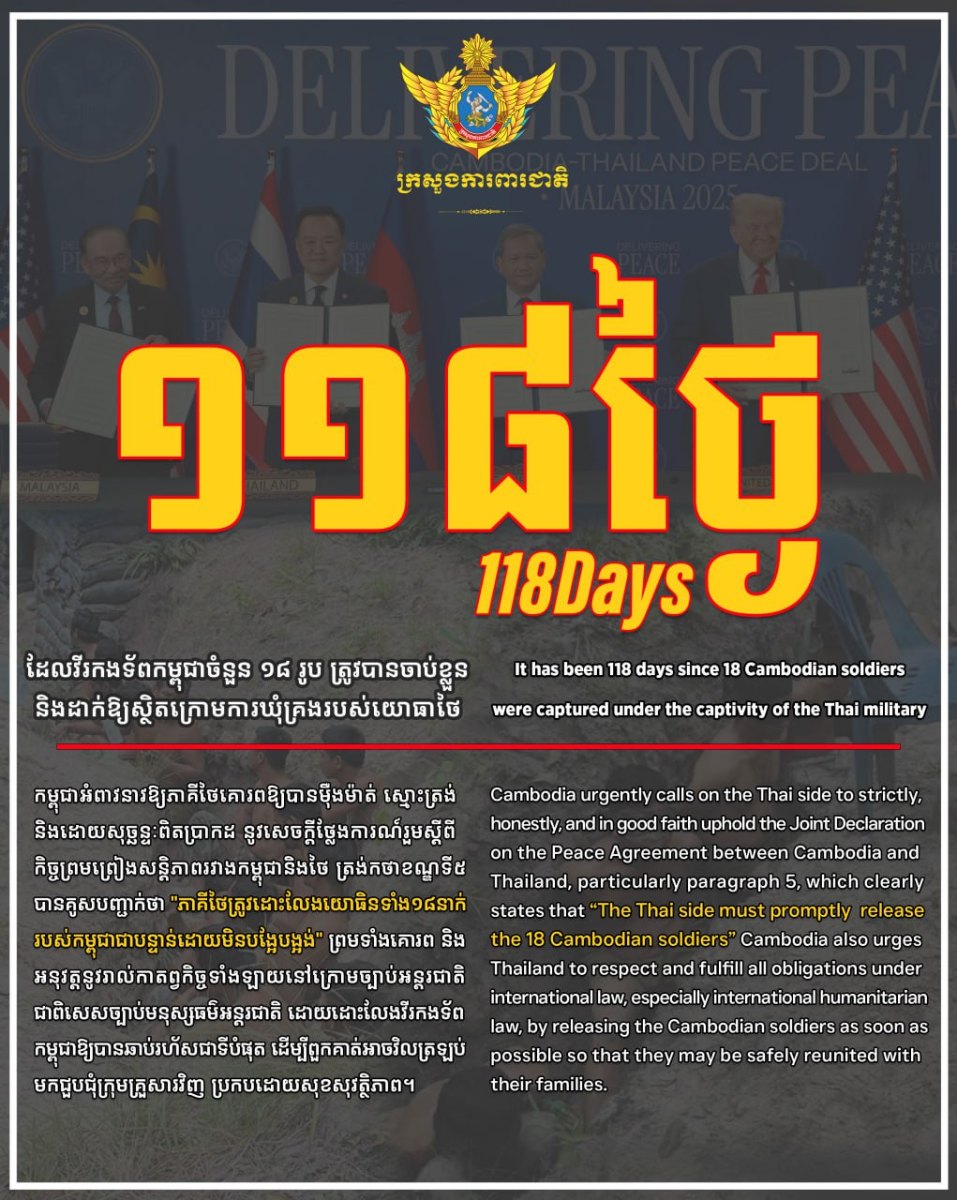 កម្ពុជាបន្ត អំពាវនាវឱ្យភាគីថៃគោរពឱ្យបានម៉ឺងម៉ាត់ ស្មោះត្រង់ និងដោយសុច្ឆន្ទៈពិតប្រាកដ នូវសេចក្តីថ្លែងការណ៍រួមស្តីពីកិច្ចព្រមព្រៀងសន្តិភាពរវាងកម្ពុជានិងថៃ ត្រង់កថាខណ្ឌទី៥ បានគូសបញ្ជាក់ថា “ភាគីថៃត្រូវដោះលែងយោធិនទាំង១៨នាក់របស់កម្ពុជាជាបន្ទាន់ដោយមិនបង្អែបង្អង់” ព្រមទាំងគោរពនិងអនុវត្តនូវរាល់កាតព្វកិច្ចទាំងឡាយនៅក្រោមច្បាប់អន្តរជាតិ ជាពិសេសច្បាប់មនុស្សធម៌អន្តរជាតិ ដោយដោះលែងវីរកងទ័ពកម្ពុជាឱ្យបានឆាប់រហ័សជាទីបំផុត ដើម្បីពួកគាត់អាចវិលត្រឡប់មកជួបជុំក្រុមគ្រួសារវិញ ប្រកបដោយសុខសុវត្ថិភាព។