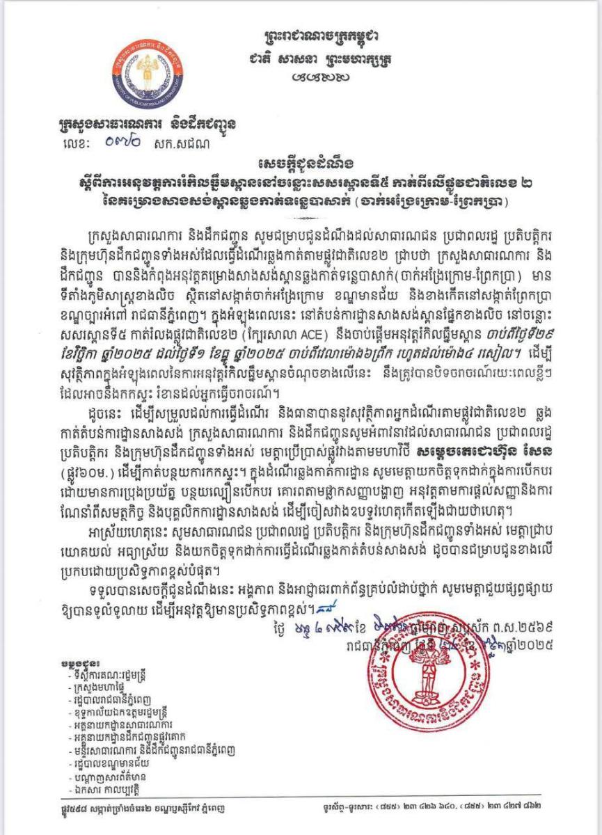 អាស្រ័យហេតុនេះ សូមសាធារណជន ប្រជាពលរដ្ឋ ប្រតិបត្តិករ និងក្រុមហ៊ុនដឹកជញ្ជូនទាំងអស់ មេត្តាជ្រាប យោគយល់ អធ្យាស្រ័យ និងយកចិត្តទុកដាក់ការធ្វើដំណើរឆ្លងកាត់តំបន់សាងសង់ ដូចបានជម្រាបជូនខាងលើ ប្រកបដោយប្រសិទ្ធភាពខ្ពស់បំផុត៕