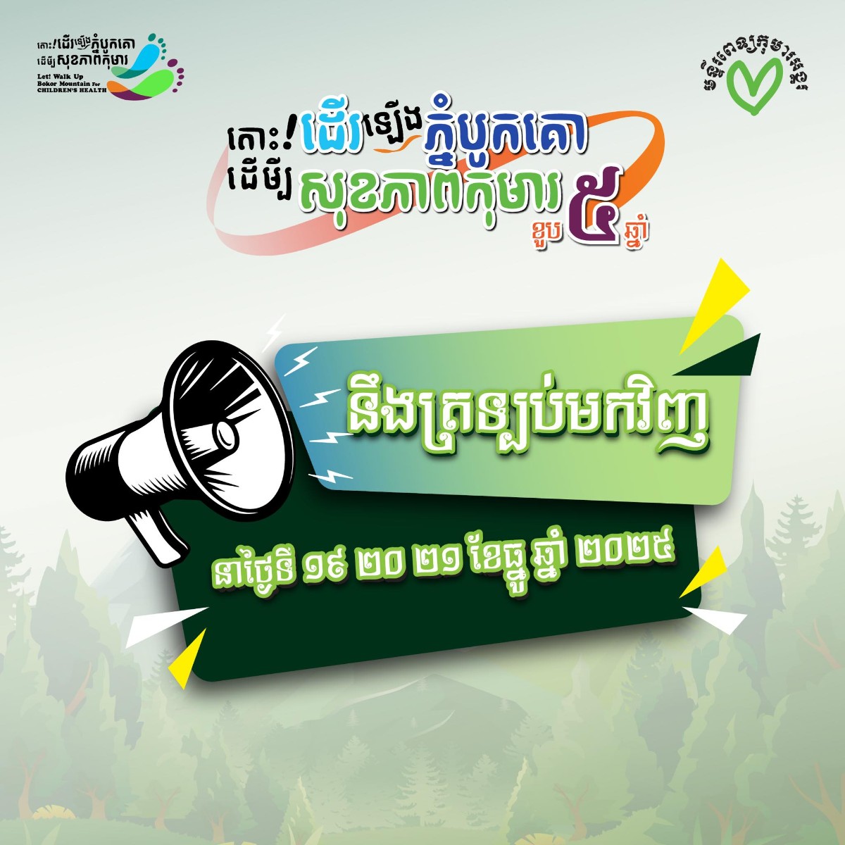 ភ្នំពេញ៖ មូលនិធិម៉ានី និងសប្បុរសជននានា បានបង្កើតព្រឹត្តិការណ៍រួមគ្នា ដើរឡើងភ្នំបូកគោ ដើម្បីរាយអង្គាសថវិកាជួយមន្ទីរពេទ្យកុមារអង្គរ ក៏ជាការចូលរួមចំណែក ដើម្បីសង្គ្រោះអាយុជីវិតកុមារ ដែលទៅរកសេវាសុខាភិបាល ក្នុងមន្ទីរពេទ្យមួយនេះ ហើយព្រឹត្តិការណ៍នេះ នឹងធ្វើឡើងរយៈពេល៣ថ្ងៃ ចាប់ពីថ្ងៃទី១៩ ដល់២១ ខែធ្នូ ឆ្នាំ២០២៥ ។
