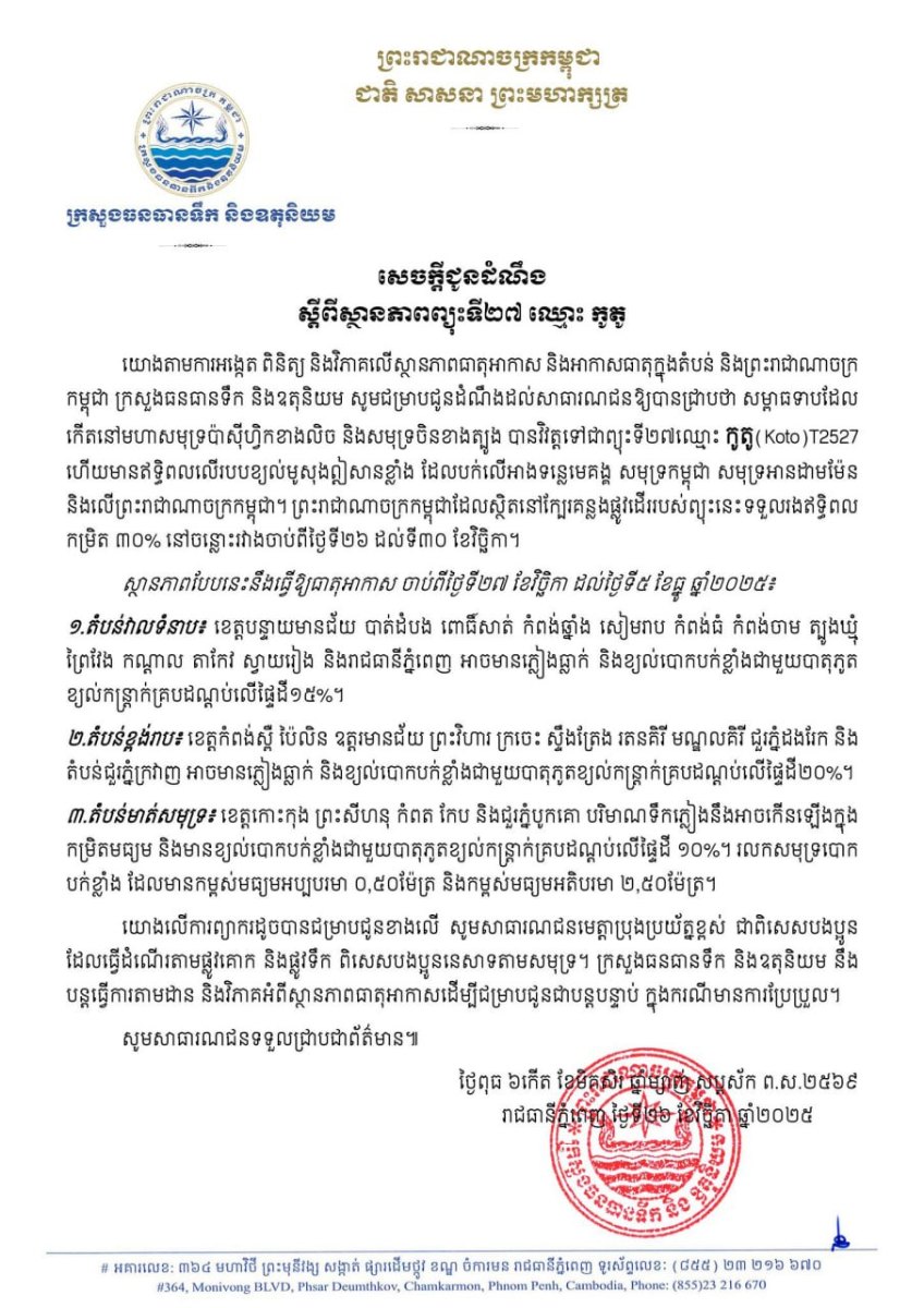ដោយឥទ្ធិពលស្ថានភាពព្យុះទី២៧ ឈ្មោះ កូតូ ធាតុអាកាសនៅកម្ពុជា ចាប់ពីថ្ងៃទី២៧ វិច្ឆិកាដល់សប្ដាហ៍ទីមួយខែធ្នូ អាចមានភ្លៀងធ្លាក់ និងខ្យល់បោកបក់ខ្លាំងជាមួយបាតុភូតខ្យល់កន្ត្រាក់។ នេះបើយោងតាម សេចក្ដីជូនដំណឹងរបស់ ក្រសួងធនធានទឹក និងឧតុនិយម សូមជម្រាបជូនដំណឹងដល់សាធារណជនឱ្យបានជ្រាបស្ដីពីស្ថានភាពព្យុះទី២៧ ឈ្មោះ កូតូ ចាប់ពីថ្ងៃទី២៧ ខែវិច្ឆិកា ដល់ថ្ងៃទី៥ ខែធ្នូ ឆ្នាំ២០២៥៕