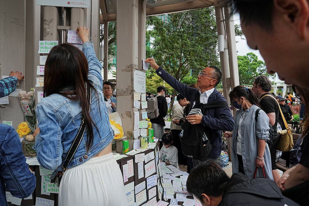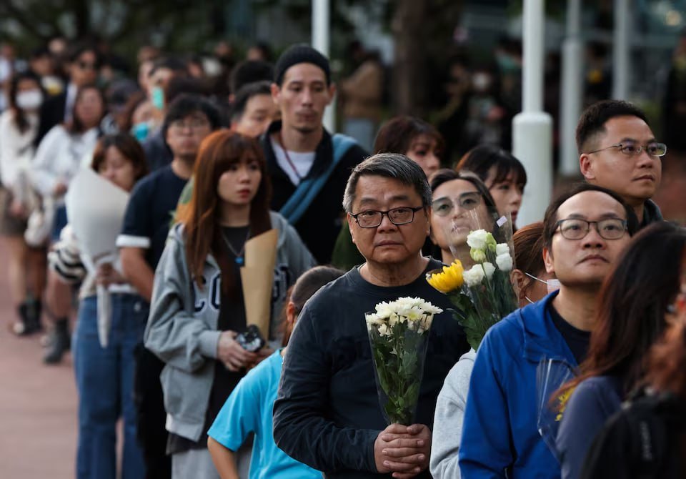 ហ្វូងមនុស្សយ៉ាងកុះករបានតម្រង់ជួរដែលលាតសន្ធឹងជាង ១គីឡូម៉ែត្រ តាមបណ្តោយច្រាំងទន្លេក្បែរអគារលំនៅដ្ឋានរបស់តុលាការ Wang Fuk ដែលត្រូវឆេះ ដើម្បីដាក់ផ្កាគោរពវិញ្ញាណក្ខន្ធអ្នកស្លាប់។