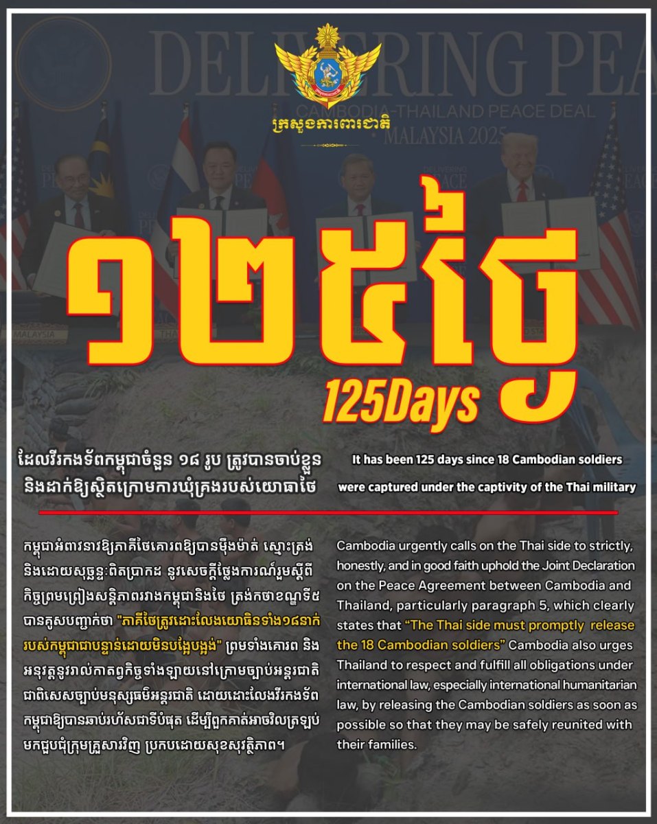 កម្ពុជាអំពាវនាវឱ្យភាគីថៃគោរពឱ្យបានម៉ឺងម៉ាត់ ស្មោះត្រង់ និងដោយសុច្ឆន្ទៈពិតប្រាកដ នូវសេចក្តីថ្លែងការណ៍រួមស្តីពីកិច្ចព្រមព្រៀងសន្តិភាពរវាងកម្ពុជានិងថៃ ត្រង់កថាខណ្ឌទី៥ បានគូសបញ្ជាក់ថា “ភាគីថៃត្រូវដោះលែងយោធិនទាំង១៨នាក់របស់កម្ពុជាជាបន្ទាន់ដោយមិនបង្អែបង្អង់” ព្រមទាំងគោរពនិងអនុវត្តនូវរាល់កាតព្វកិច្ចទាំងឡាយនៅក្រោមច្បាប់អន្តរជាតិ ជាពិសេសច្បាប់មនុស្សធម៌អន្តរជាតិ ដោយដោះលែងវីរកងទ័ពកម្ពុជាឱ្យបានឆាប់រហ័សជាទីបំផុត ដើម្បីពួកគាត់អាចវិលត្រឡប់មកជួបជុំក្រុមគ្រួសារវិញ ប្រកបដោយសុខសុវត្ថិភាព។