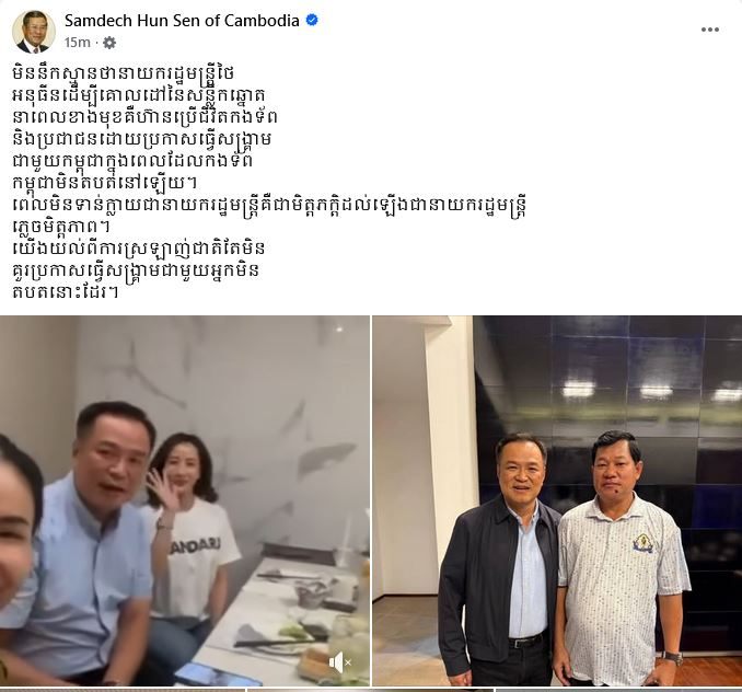ភ្នំពេញ៖ នៅរសៀលថ្ងៃទី៨ ខែធ្នូ នេះ សម្ដេចតេជោ ហ៊ុន សែន បានទម្លាយសារ ភ្ជាប់ជាមួយរូបថត និងវីដេអូ លោក អនុធីន នាយករដ្ឋមន្រ្ដីថៃ, ដោយសម្ដេចបានបញ្ជាក់ថា លោក អនុធីន ដើម្បីគោលដៅសន្លឹកឆ្នោតហ៊ានប្រើជីវិតកងទ័ព និងប្រជាជនដោយប្រកាសធ្វើសង្គ្រាម ជាមួយកម្ពុជា។