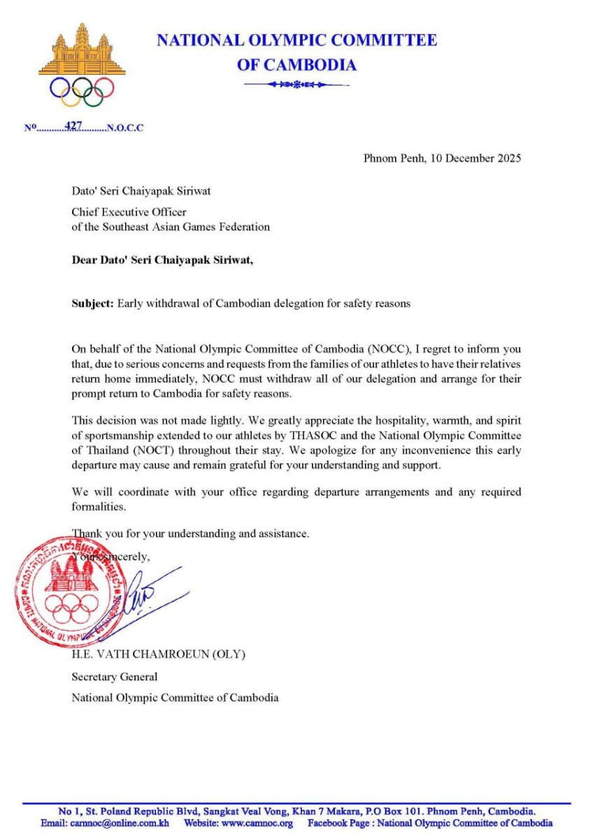 លិខិតផ្លូវការបន្ថែមថា គណៈកម្មាធិការជាតិអូឡាំពិកកម្ពុជា ជូនដំណឹងដល់ក្រុមប្រឹក្សាកីឡាអាស៊ីអាគ្នេយ៍ និងគណៈកម្មការរៀបចំស៊ីហ្គេមឆ្នាំ២០២៥ អំពីការសម្រេចដកខ្លួនភ្លាមៗ ដើម្បីត្រឡប់មកប្រទេសកម្ពុជាវិញរបស់ក្រុមប្រតិភូកីឡាកម្ពុជា ដោយសារក្រុមគ្រួសារប្រតិភូកីឡាកម្ពុជា សម្ដែងនូវការព្រួយបារម្ភអំពីសុវត្ថិភាព។