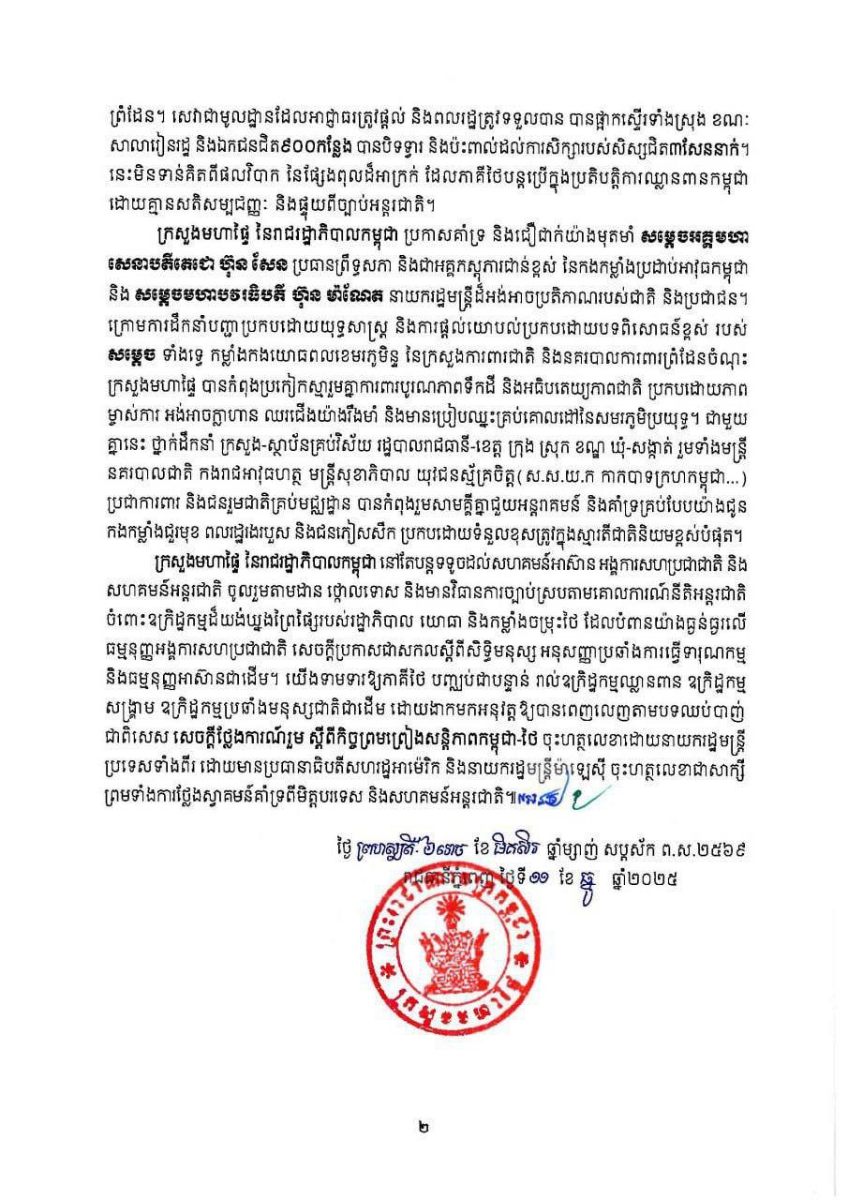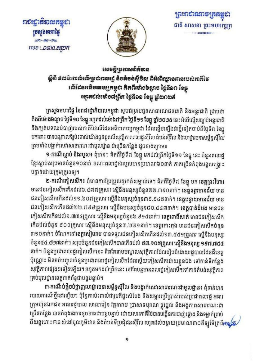 ក្រសួងមហាផ្ទៃ នៃរាជរដ្ឋាភិបាលកម្ពុជា បានចេញ សេចក្តីប្រកាសព័ត៍មានថា គិតពីម៉ោង ៦ល្ងាច ម្សិលមិញ ថ្ងៃទី១០ ខែធ្នូ រហូតដល់ម៉ោង ៧ព្រឹកនេះ ថ្ងៃទី១១ ខែធ្នូ ឆ្នាំ២០២៥ នេះ អំពើល្មើសច្បាប់អន្តរជាតិ និងក្បត់បទឈប់បាញ់របស់ភាគីថៃលើដែនអធិបតេយ្យកម្ពុជា ដែលផ្តើមឡើងជាថ្មីទៀតចាប់ពីថ្ងៃទី៧ ខែធ្នូ មកនោះ បានបណ្តាលឱ្យប៉ះពាល់យ៉ាងធ្ងន់ធ្ងរលើសុវត្ថិភាពពលរដ្ឋស៊ីវិល តំបន់ស៊ីវិល និងហេដ្ឋារចនាសម្ព័ន្ធស៊ីវិល ព្រមទាំងបង្អាក់សេវាសាធារណៈជាមូលដ្ឋាន ជាច្រើនកន្លែង។ ហេតុការណ៍នេះនាំឱ្យមាន ជនភៀសសឹកបានកើនដល់ ៦ខេត្ត មានសរុបចំនួនជនភៀសសឹកបានកើនដល់ ៥៧ ១០៥គ្រួសារ ស្មើនឹងមនុស្ស ១៩៧ ៧៥៤ នាក់។
