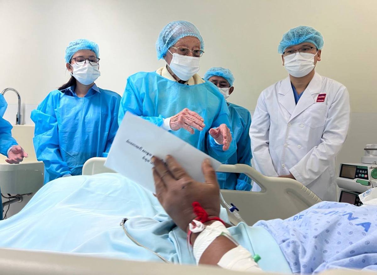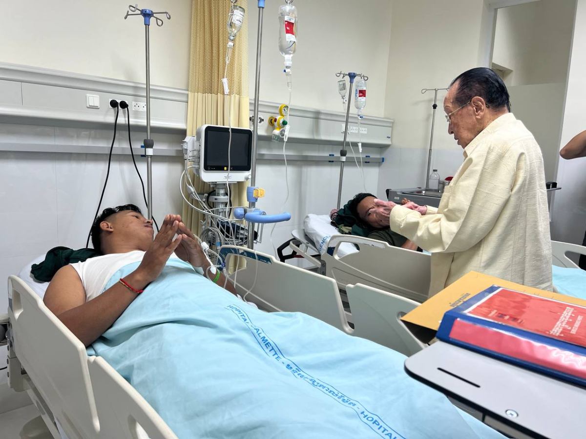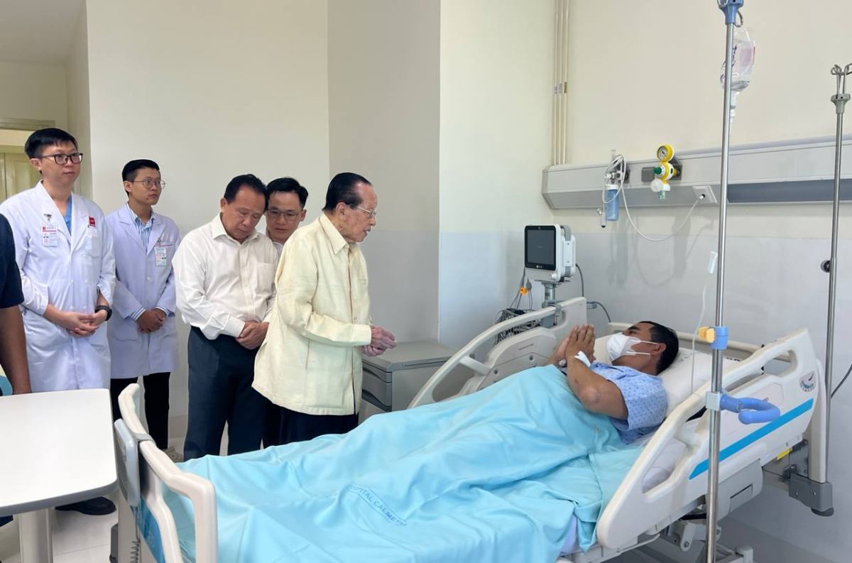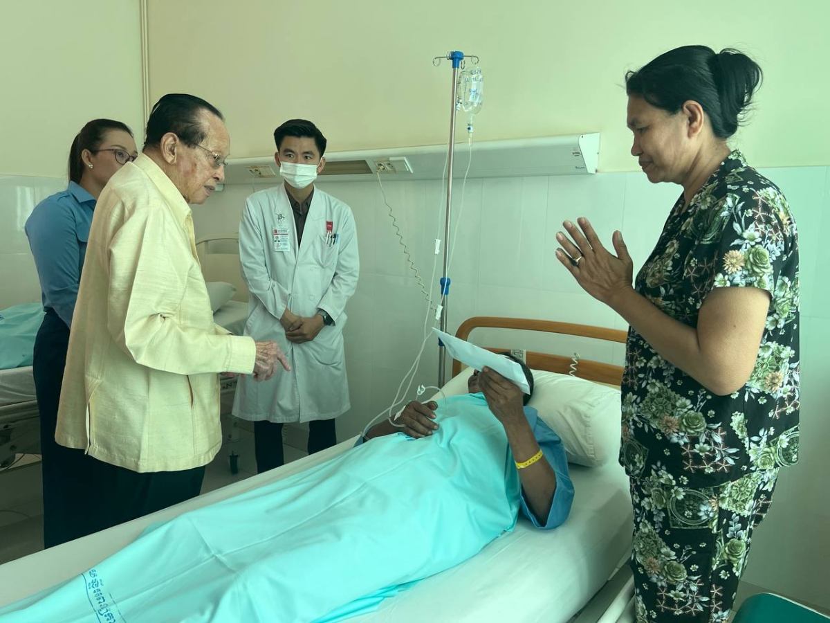 ភ្នំពេញ៖ សម្ដេចឥស្សរវិទេសបញ្ញា ហោ ណាំហុង ឧត្តមប្រឹក្សាផ្ទាល់ព្រះមហាក្សត្រ អញ្ជើញ ទៅសួរសុខទុក្ខ និងនាំយកថវិកាមួយចំនួន ទៅផ្ដល់ជូនដល់យុទ្ធជនរងរបួស ដោយសារអំពើ ឈ្លានពានបូរណភាពទឹកដីកម្ពុជា ពីសំណាក់កងទ័ពថៃ ចំនួន១២រូប កំពុងសម្រាកព្យាបាល នៅក្នុងមន្ទីរពេទ្យកាល់ម៉ែត ។