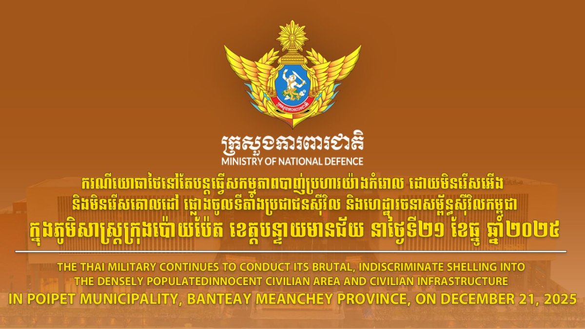 ក្រសួងការពារជាតិកម្ពុជា បានឱ្យដឹងថា យោធាថៃនៅតែបន្តធ្វើសកម្មភាពបាញ់ប្រហារចូលទីតាំងប្រជាជនស៊ីវិលកម្ពុជា និងហេដ្ឋារចនាសម្ព័ន្ធស៊ីវិល នៅយោធភូមិភាគទី៥ ក្នុងភូមិសាស្រ្ត ឃុំនិមិត្ត ស្រុកអូជ្រៅ ខេត្តបន្ទាយមានជ័យ នាថ្ងៃទី២១ ខែធ្នូ ឆ្នាំ២០២៥៖