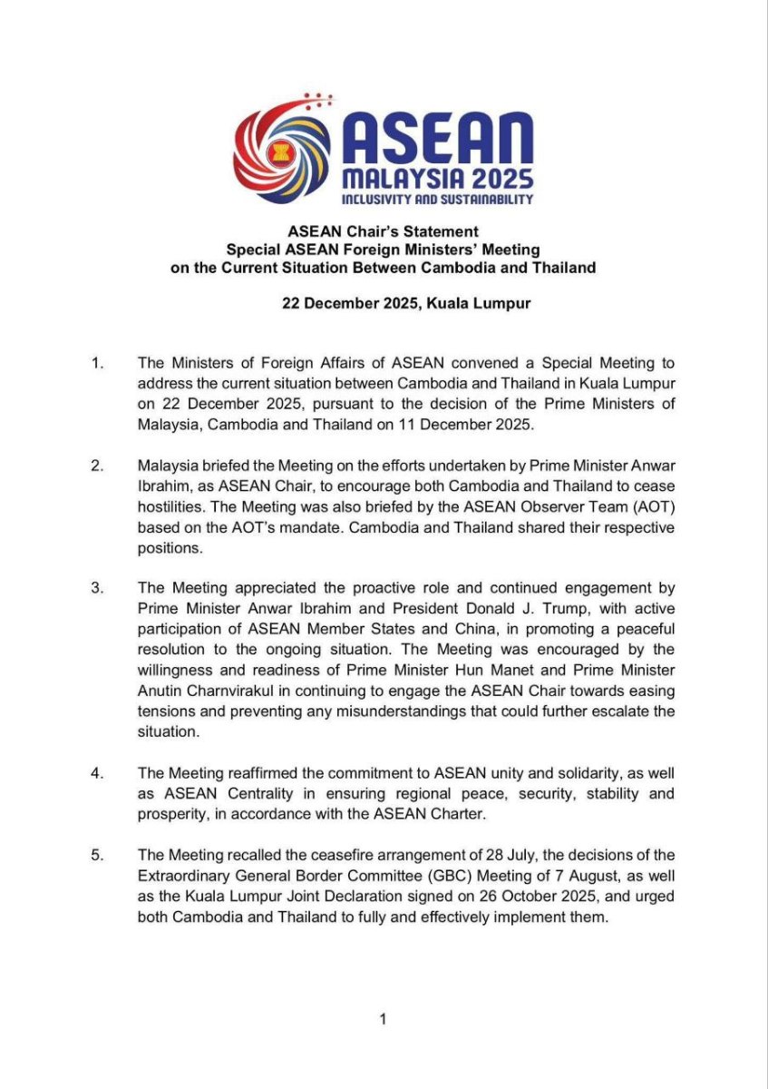 សេចក្តីថ្លែងការណ៍របស់ប្រធានអាស៊ានបានស្វាគមន៍ការពិភាក្សាស្តីពីការបន្តបទឈប់បាញ់ និងបញ្ឈប់នូវអរិភាពទាំងឡាយ ខណៈដែលរដ្ឋមន្ត្រីការបរទេសអាស៊ានបានសម្តែងក្តីសង្ឃឹមសម្រាប់ការបន្ថយភាពតានតឹងនៅដំណាក់កាលដំបូង។