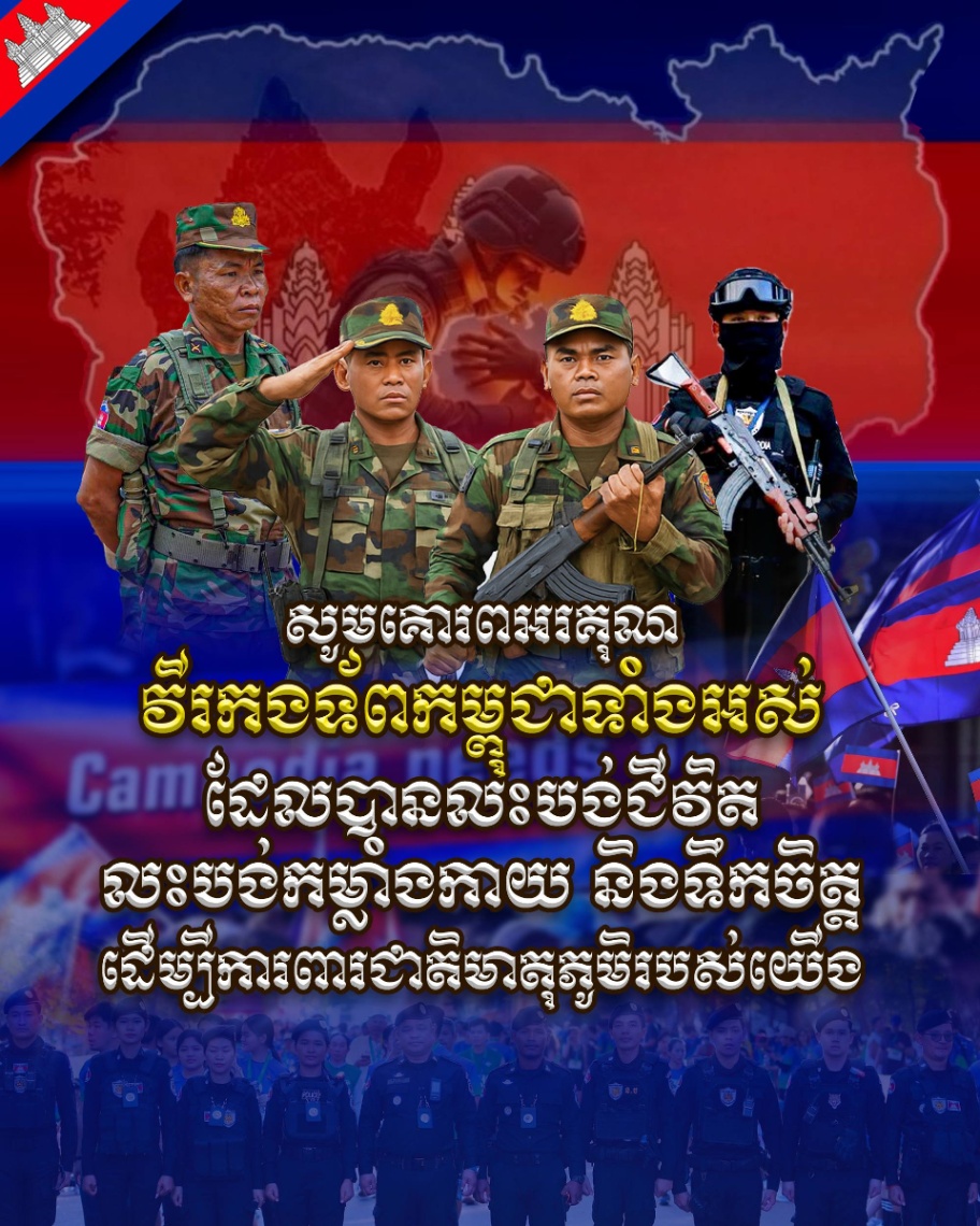 តាមរយៈសារពិសេស សម្ដេចធិបតី បានសម្តែងនូវការដឹងគុណដ៏ជ្រាលជ្រៅបំផុត ចំពោះការលះបង់មិនអាចកាត់ថ្លៃបាន របស់វីរកងទ័ព និង វីរនគរបាល ដ៏អង់អាចក្លាហានគ្រប់រូប ក្នុងការបំពេញភារកិច្ចដ៏ឧត្តុងឧត្តមនៃការកាពារអធិបតេយ្យជាតិ និងបូរណភាពទឹកដី, ហើយក៏សូមសម្តែងនូវការកោតសរសើរ និង អំណរគុណយ៉ាងជ្រាលជ្រៅបំផុតផងដែរចំពោះស្មារតីស្នេហាជាតិមាតុភូមិ និងស្មារតីសាមគ្គីជាតិជាធ្លុងមួយ ក្នុងការការពារអធិបតេយ្យជាតិ និង បូរណភាពទឹកដី របស់ព្រះសង្ឃគ្រប់ព្រះអង្គ និងជនរួមជាតិគ្រប់រូប, ពីគ្រប់ទិសទី, ទាំងក្នុង និងក្រៅប្រទេស។ គុណូបការៈទាំងនេះពិតជាមានតម្លៃលើសអ្វីៗទាំងអស់ ហើយនឹងត្រូវបានចារទុកក្នុងប្រវត្តិសាស្រ្ត សម្រាប់ប្រជាពលរដ្ឋកម្ពុជា គ្រប់រូប និងគ្រប់ជំនាន់៕