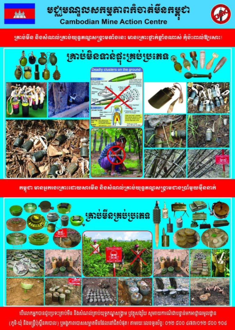 មជ្ឈមណ្ឌលសកម្មភាពកំចាត់មីនកម្ពុជា ក៏បានអំពាវនាវ នៅពេលលោកអ្នកប្រទះឃើញគ្រាប់មីន គ្រាប់យុទ្ធភណ្ឌមិនទាន់ផ្ទុះ គ្រាប់បែកចង្កោម និងវត្ថុចំលែកសង្ស័យជាគ្រាប់ សូមកុំប៉ះពាល់ និងសូមរាយការណ៍ជាបន្ទាន់ទៅអាជ្ញាធរមានសមត្ថកិច្ច ប៉ុស្តិ៍នគរបាល មេភូមិ មេឃុំ និងប្រតិបត្តិករបោសសម្អាតមីនរបស់អង្គភាពស៊ីម៉ាក់ដែលនៅក្បែរលោកអ្នក៕