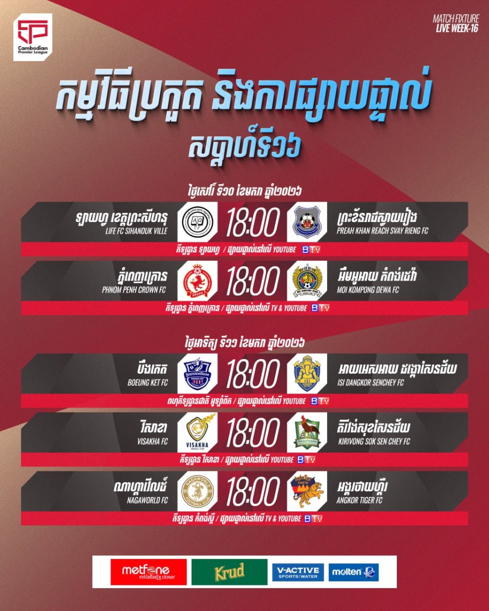 ការប្រកួតលីគកំពូលកម្ពុជា ឆ្នាំ២០២៥/២៦ នឹងបន្ដការប្រកួតសន្សំពិន្ទុ ជុំទី២ សប្ដាហ៍ទី១៦ នាចុងសប្ដាហ៍នេះ ដោយមាន ៥ប្រកួតពេញ ក្នុងនោះក្រុមណាហ្គាវើលដ៏ នឹងត្រូវបើកទ្វារផ្ទះទទួលក្រុមអង្គរថាយហ្គឺរ នៅកីឡដ្ឋានខេត្តកំពង់ស្ពឺ គ្រាដែលក្រុមព្រះខ័នរាជស្វាយរៀង ភ្នំពេញក្រោន បឹងកេត និងវិសាខា ត្រូវជួបគូប្រជែងផ្សេងគ្នា។