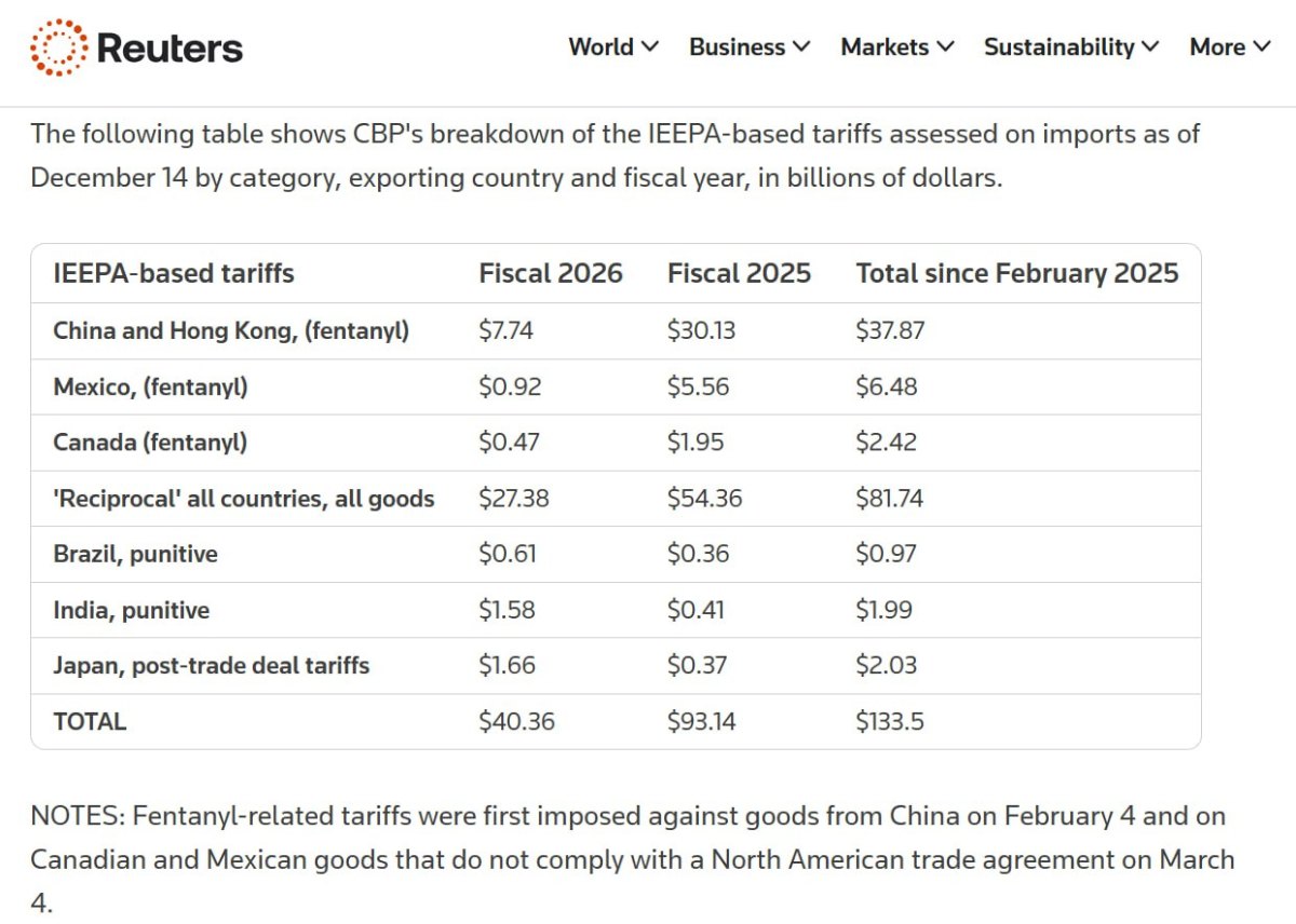 ទិន្នន័យបង្ហាញថា ពន្ធទាក់ទងនឹងច្បាប់អំណាចសេដ្ឋកិច្ចបន្ទាន់អន្តរជាតិ ឬ IEEPA របស់លោក Trump បានបង្កើតប្រាក់ចំណូលប្រមាណ ១៣៣,៥ ពាន់លានដុល្លារ ពីការប្រមូលពន្ធ ចន្លោះថ្ងៃទី៤ ខែកុម្ភៈ ឆ្នាំ២០២៥ ដល់ថ្ងៃទី ១៤ ខែធ្នូ ឆ្នាំ២០២៥ ដែលជាកាលបរិច្ឆេទទិន្នន័យថ្មីបំផុតពីទីភ្នាក់ងារគយ និងការពារព្រំដែនអាមេរិក (CBP)។ យោងតាមការគណនាដោយសារព័ត៌មានរ៉យទ័រ បានបង្ហាញថា ចំនួនសរុបបច្ចុប្បន្ន ត្រូវប៉ាន់ប្រមាណថា នឹងខិតជិត ១៥០ពាន់លានដុល្លារ ដោយផ្អែកលើការបន្តប្រមូលពន្ធប្រចាំថ្ងៃជាមធ្យម ចាប់ពីចុងខែកញ្ញា ដល់ពាក់កណ្តាលខែធ្នូ កន្លងទៅ៕